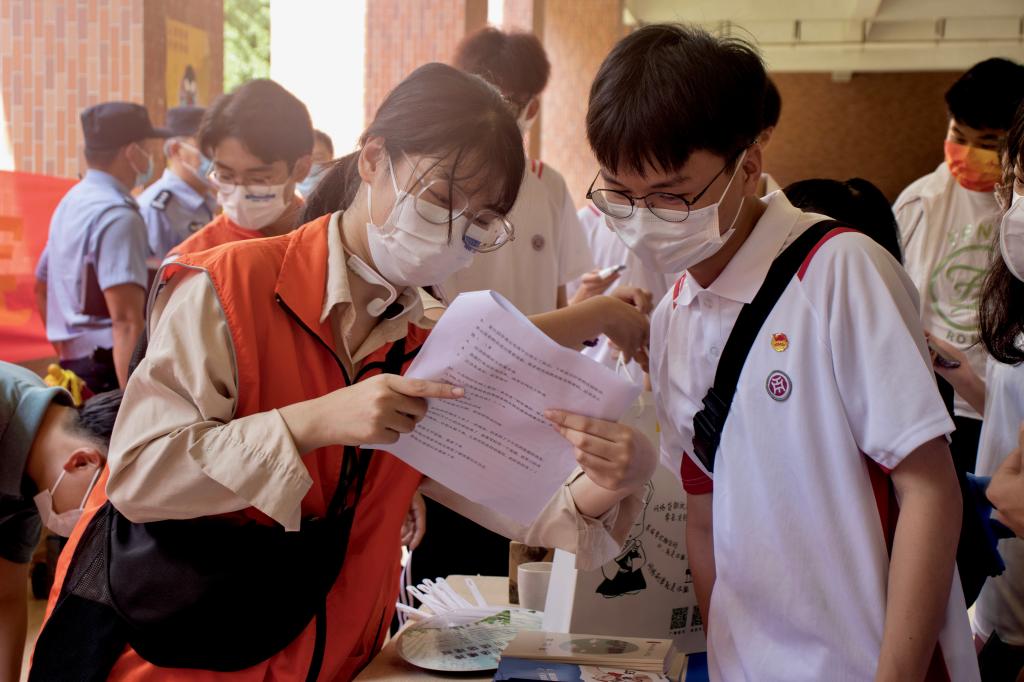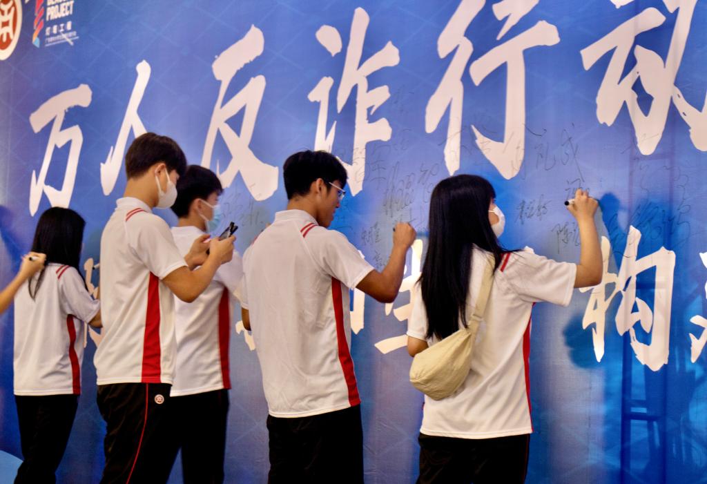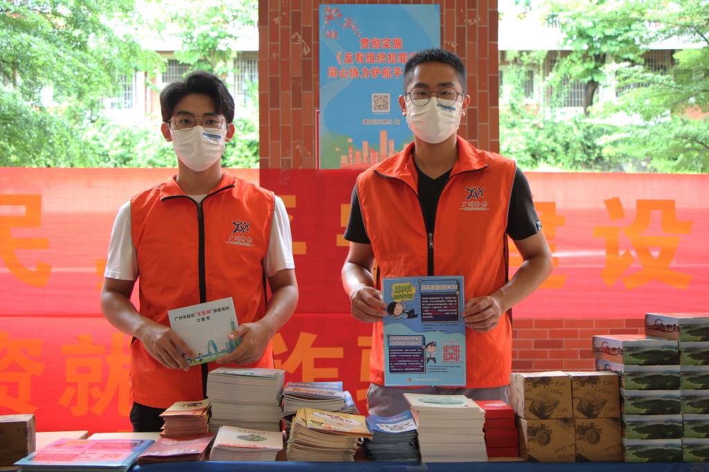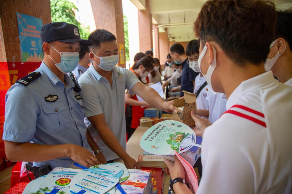 现场师生纷纷到荔湖街综治办在大厅开设的宣传点了解反诈骗相关知识,民警同志和街道办工作人员通过现场派发资料册、宣传单、小礼品等形式向师生普及反诈骗知识,号召现场师生下载“国家反诈中心”app。