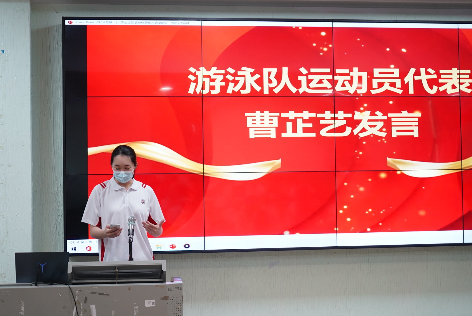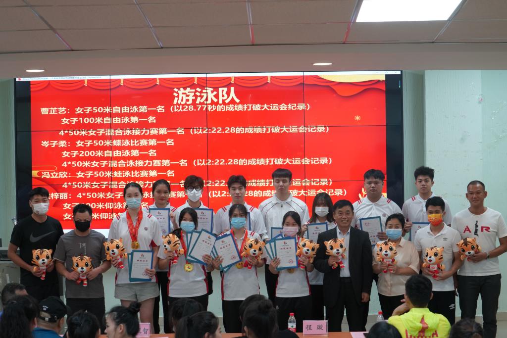 杨俊萍首先总结了我校参加本届大运会基本情况和获奖成果,我校首次派出游泳、健美操、武术、羽毛球和篮球5支代表队,共计55人参加了大运会12个项目中的5个项目比赛,获得了6金1银,5个第4名、6个第5名、3个第6名、3个第8名,破2项大运会女子丙组游泳记录,总奖牌榜位居高职院校第6名,代表团也被评为体育道德风尚奖代表团。以此同时,杨俊萍也对做出突出贡献的运动员和教练员们予以表扬,对领导的关怀与支持表示感谢,同时也对我校体育工作提出了希冀。