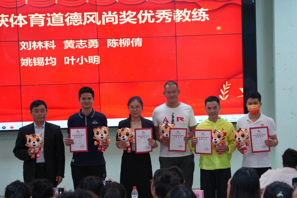 林琨智为道德风尚奖优秀教练刘林科、黄志勇、姚锡均、陈柳倩、叶小明老师颁奖