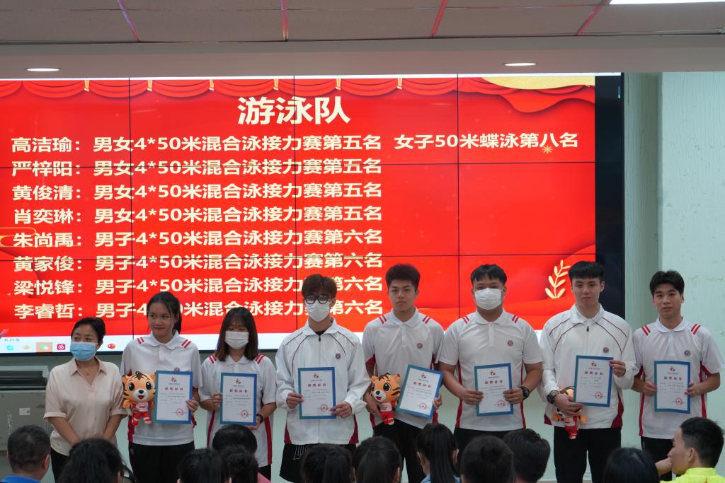 杨俊萍为游泳队获奖队员高洁瑜,严梓阳,黄俊清,肖奕琳,朱尚禹,黄家俊,梁悦锋,李睿哲同学颁奖