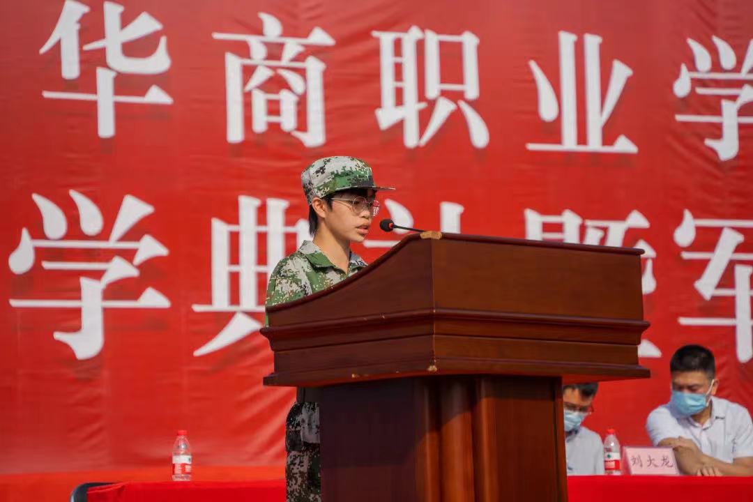 新生代表曾玉婷发言。她表示来到新的环境,要有良好的心态,要以积极向上的心态度过大学时光。军训虽是辛苦的,但也是一种挑战,它不仅是对身体的磨练,更是对心理上的考验。在军训中能够学习到的不仅仅是整内务,练军姿,更重要的是懂得什么是军人的灵魂,什么是国家的栋梁,从而激发“路漫漫其修远兮,吾将上下而求索”的顽强意志。提到未来,曾玉婷鼓舞大家一起设立一个清晰的理想和具体的目标,做一个有方向,敢于拼搏,保持自律的大学生。