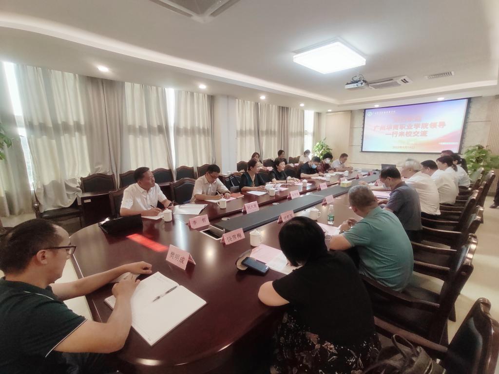 广州番禺职业学院党委书记林洽生、校长何友义、副校长刘佳环、副校长欧阳丽及教务处、科技处、财金学院、旅游商务学院、高职教育研究所(发展规划办公室)等相关部门领导出席了交流座谈。首先,何友义介绍了创建国家示范性高职院校、国家“双高计划”建设单位“30强”的成功经验。随后,我校李训贵副校长介绍了学校基本概况,她表示,广州番禺职业学院有很多成功的办学经验值得我们学习借鉴。接着,刘佳环副校长、欧阳丽副校长分别就科研工作、教学工作、实训室等方面的建设情况作了介绍。高职教育研究所(发展规划办公室)樊明成所长就发展规划、高职教育研究、决策咨询等方面的情况作了介绍。