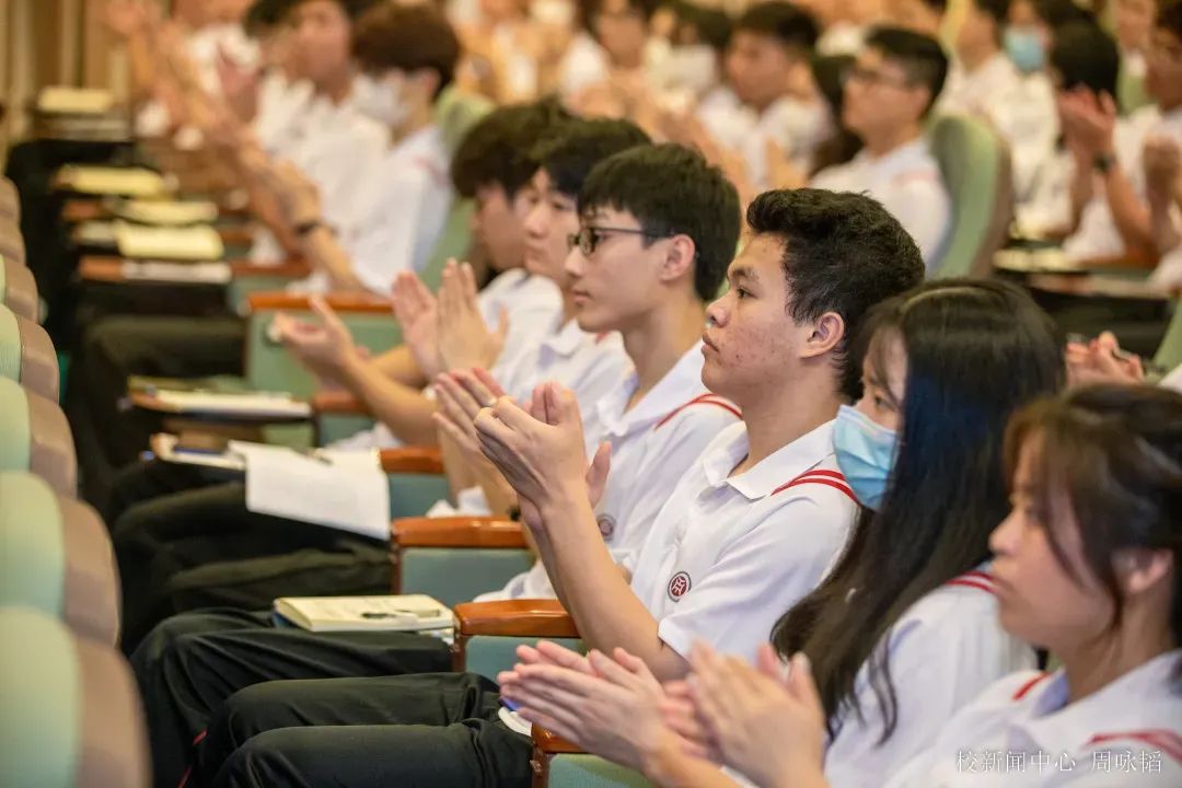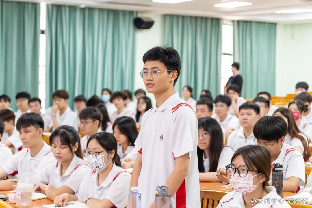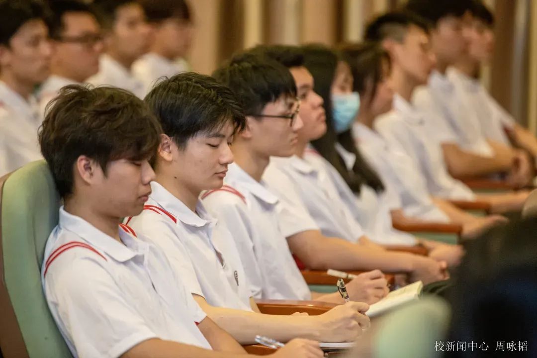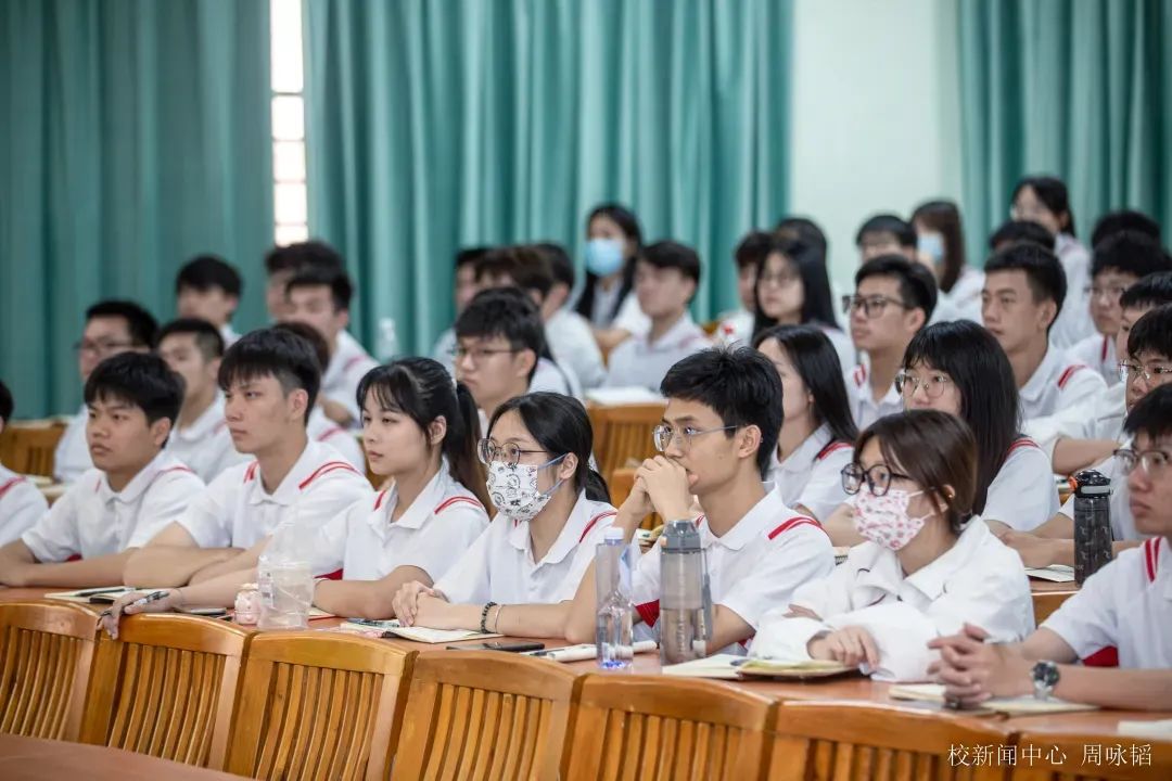 开班仪式后,翁礼成教授以“坚定‘四个自信’,以党的指导思想作为行动指南”为主题作第一讲授课。翁礼成教授以党章第一段为引题,从狭义和广义两个方面解释了什么是马克思主义;而后讲到毛泽东思想的三大法宝,实事求是、独立自主、群众路线,通过杰出校友廖志略的事例,讲述做到独立自主就需要做好人生规划,为就业做好技术、知识、能力等方面的准备;再全面回顾了毛泽东思想和中国特色社会主义理论体系的深刻内涵,讲述了坚定道路自信、理论自信、制度自信、文化自信的提出过程和内在联系。他强调,新时代中国青年要听党话、跟党走,坚定“四个自信”,以党的指导思想作为行动指南,为实现中华民族伟大复兴的中国梦而奋斗。