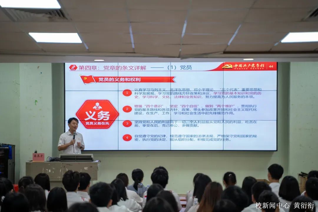 仲恺农业工程学院党委组织部副部长梁其才同志作第二讲授课。他从党章的发展历程、现有的党章的基本构架、党章的总纲部分、党章的条文部分和学习践行党章,争做合格党员五个方面讲述。他希望大家能成为“平常时候看得出来、关键时刻站得出来、危难关头豁得出来”的共产党员。他强调,新时代新征程,要切实提高学习党章,遵守党章,贯彻党章,维护党章的水平,要求我们牢固树立党章意识,把党章规定要求贯彻到学习和工作中。