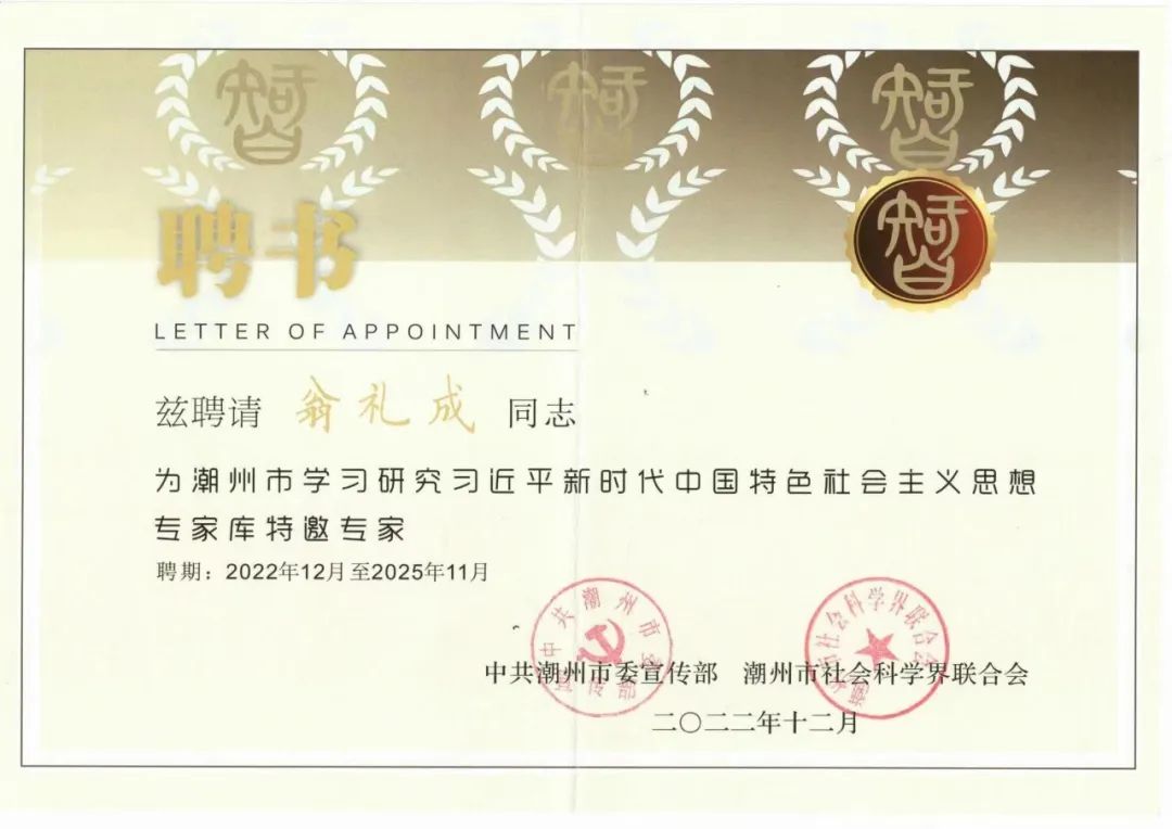 近日,我校党委书记翁礼成接到潮州市委宣传部、潮州市社会科学界联合会来函,受聘为潮州市学习研究习近平新时代中国特色社会主义思想 “特邀省级专家”。