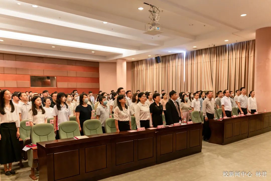 为进一步发挥先进基层组织、优秀共产党员和优秀党务工作者的先锋模范作用,引导师生深入学习贯彻习近平新时代中国特色社会主义思想,2023年6月30日,我校在会议中心四楼报告厅召开2023年“七一”表彰大会。学校领导班子、党委委员、受表彰人员、新发展党员代表参加大会,大会由学校党委副书记、副校长袁国繁主持。