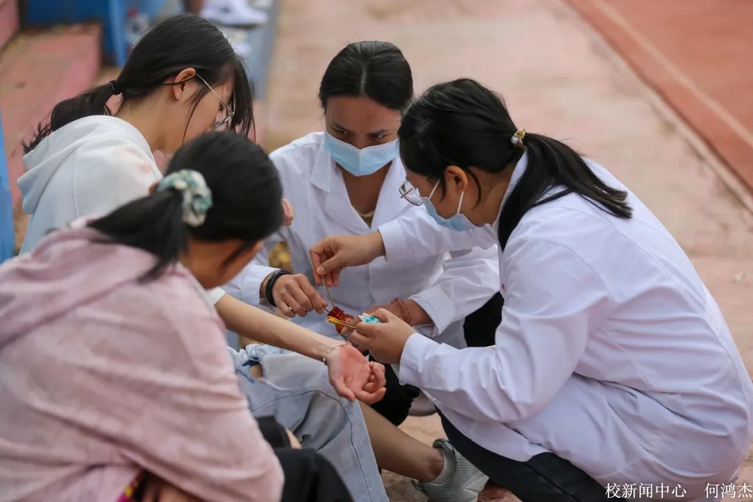 在保证抽测工作顺利完成的同时,全面保障测试学生的人身安全,预防各种突发情况发生。为此,校医室在测试场地安排应急车辆,专业医生和护士,配备好一些医疗保健药品,以便在第一时间能及时处理学生出现的各种突发情况。