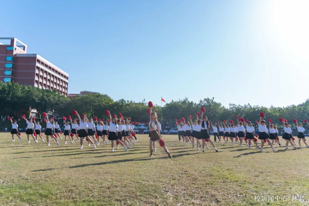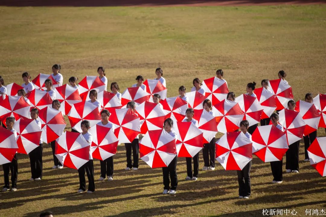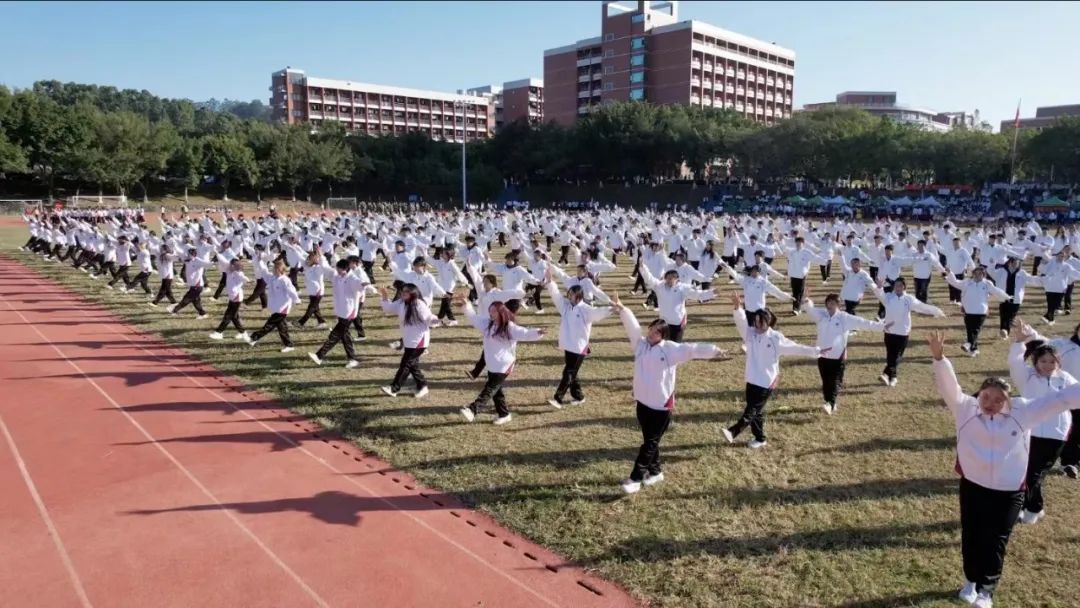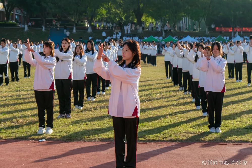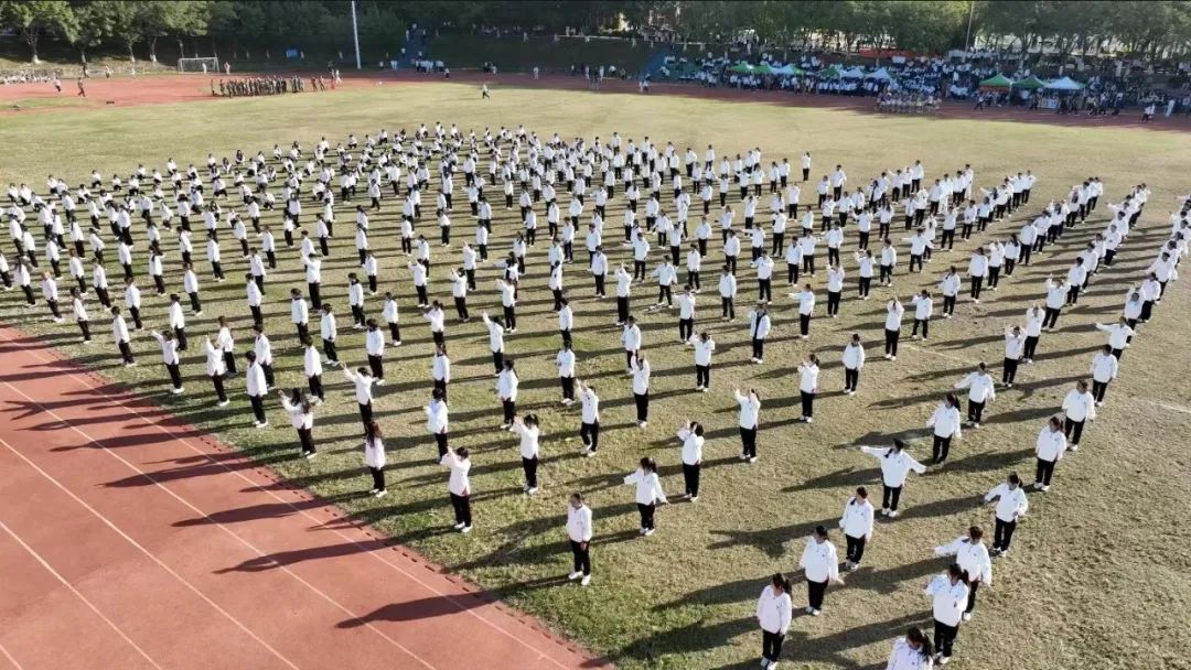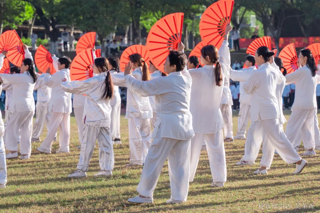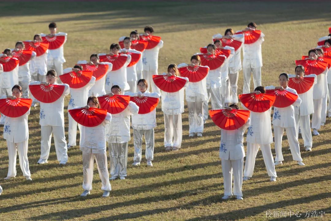 五百余名师生齐跳太极扇舞与手势操。当美妙的乐曲与舞动的扇子和双手融合,最真挚的情感由此流出。舞姿起伏之间,扇子随之摆动,舞动的扇子如火焰,似热情,气贯长虹,挥洒青春汗水。手势操的同学们有节奏地变换着不同手势,音符于指尖穿越,似惊涛拍岸,满怀壮志,谱写青春华章。