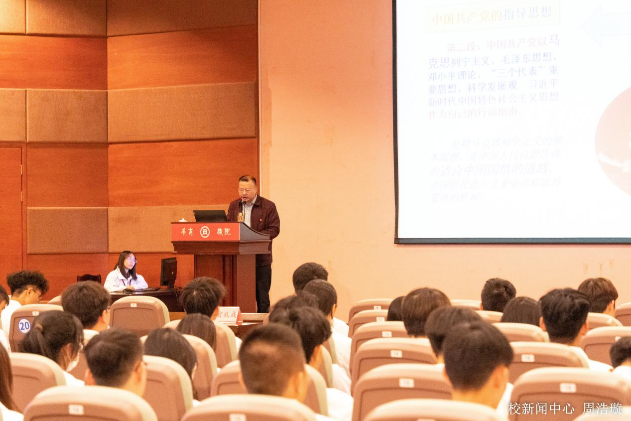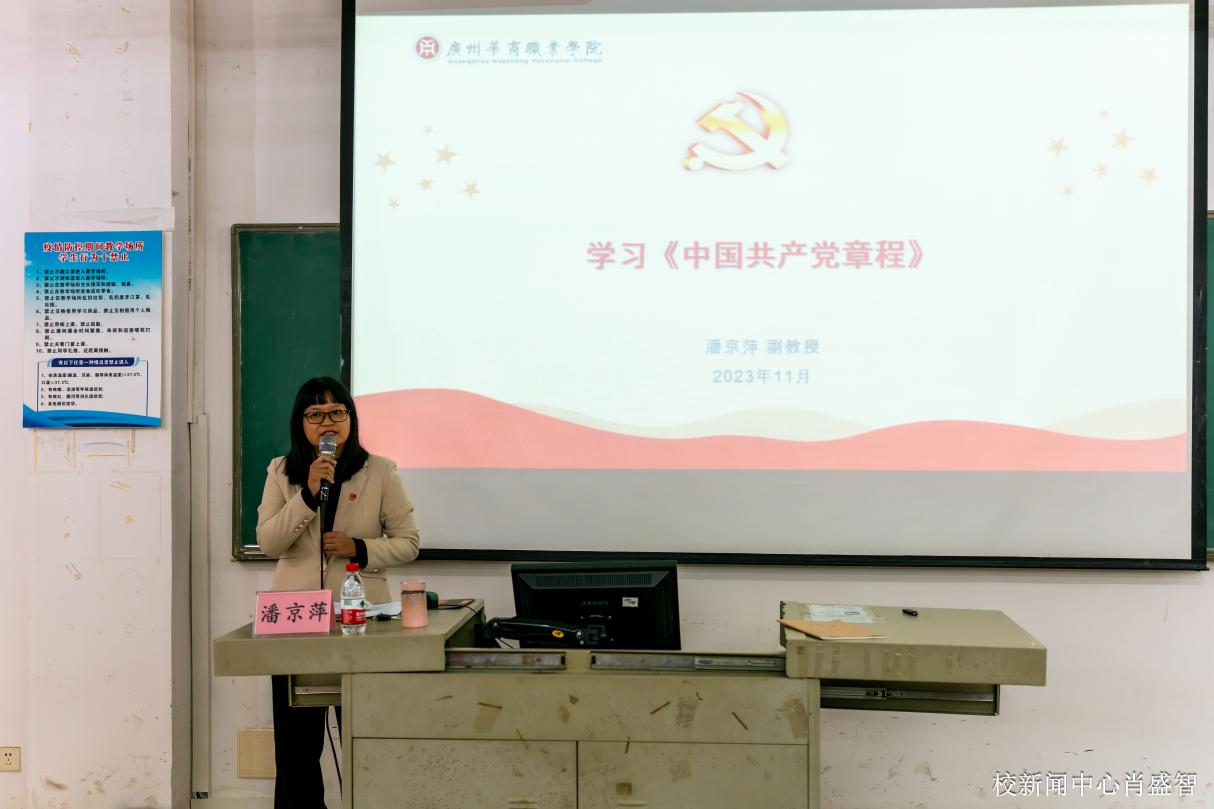 第三讲主讲人是党委组织部部长潘京萍。她采用互动式教学形式,带领大家回顾党章的发展历程。潘京萍同志号召同学们深入学习领悟践行党章,理解党章的纲领,从而坚定理想信念,提高自身政治敏锐度。她强调,我们不仅要从思想上入党,更要在行动上入党,要严格遵守党的章程,提高自身纪律性,共同维护党章的权威性!
