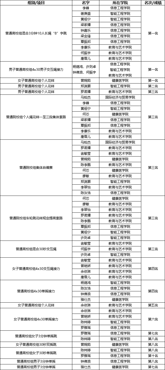 比赛分普通高校组与体育院校组2个组别,分别设置了11个比赛项目。在学校的支持,陈柳倩、黄志勇、范浩锋教练的悉心指导下,我校跳绳队队员刻苦训练,斩获15枚金牌、1枚银牌、30枚铜牌的佳绩,获普通高校组团体总分第三名!