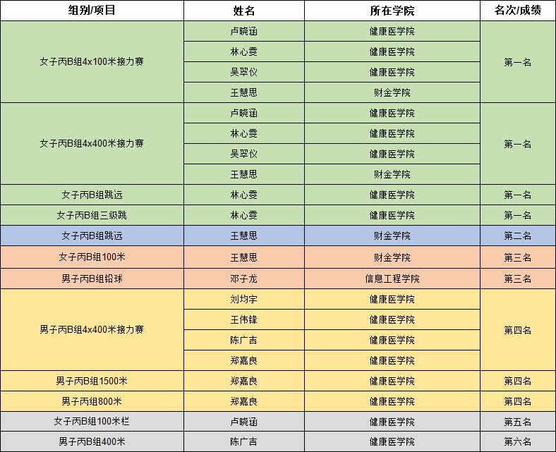 经过四天的激烈拼搏,我校荣获冠军4项、亚军1项、季军2项、第五、第六名各一项,登上丙B组团体总分第一宝座,这是我校田径项目史上最佳成绩!