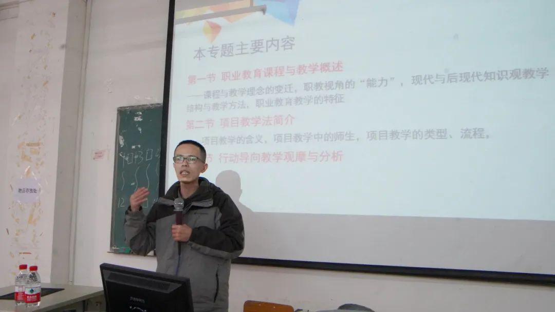 讲座围绕职业教育课程与教学概述、项目教学法简介及行动导向教学观摩、教学进度计划编制、教学活动设计、组织与实施、策划、学习目标与内容的序化+学习成果设计、考核方案制定的工作流程、要点说明、案例分析等内容开展专题培训。