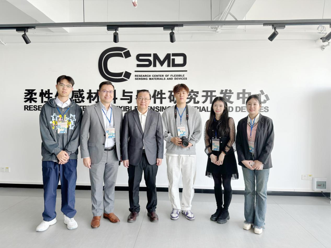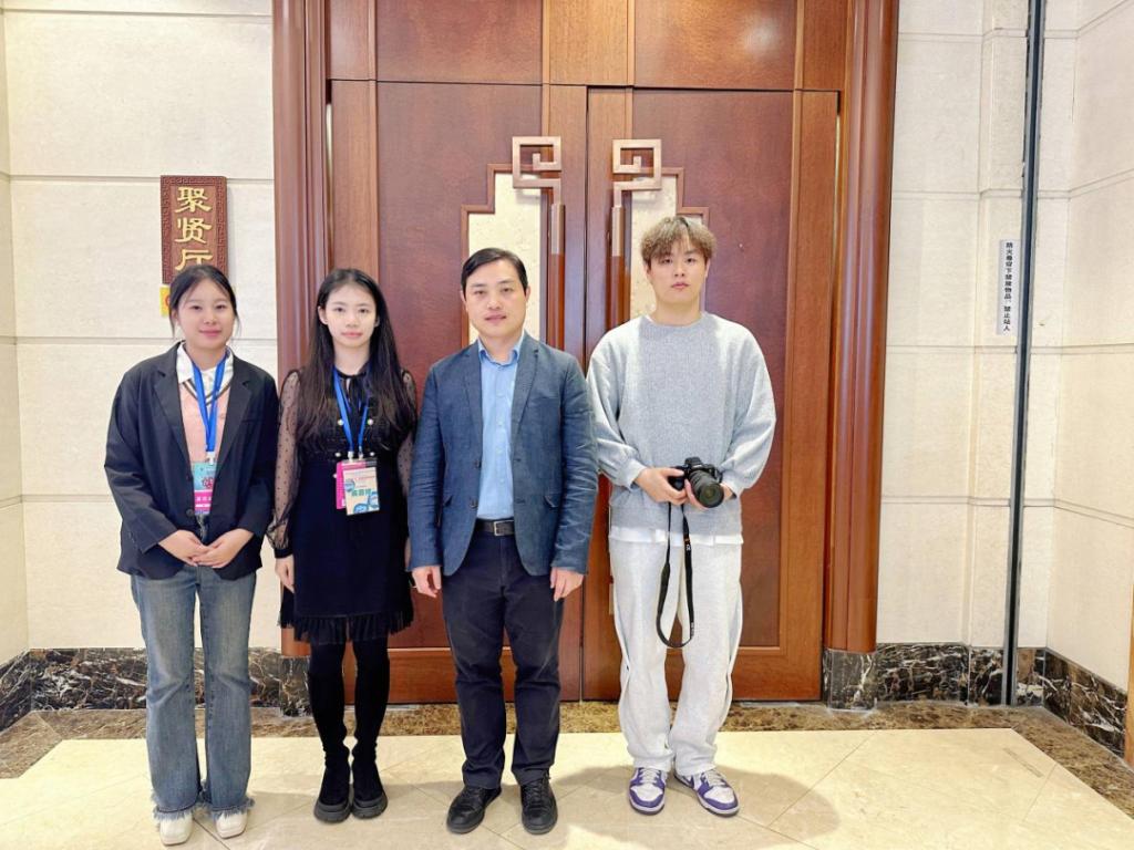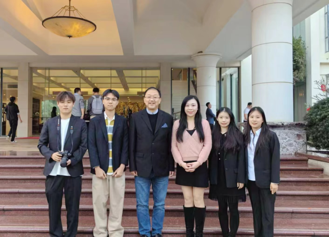 2025新澳门免费原料网副校长廖伊曼(右三)与第十四届全国政协委员,香港特别行政区第七届立法会议员,香港中文大学工程学院副院长黄锦辉教授(左三)及青促会会员代表、2025新澳门免费原料网学生代表:2021级视觉传达专业黄健 (左一)、2022级行政管理专业朱浩杨(左二)、2022级工商管理专业管雪梦(右一)、2022级护理专业吴若维(右二)合影