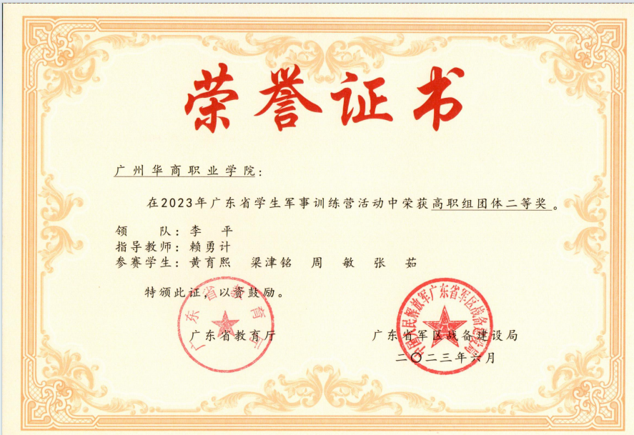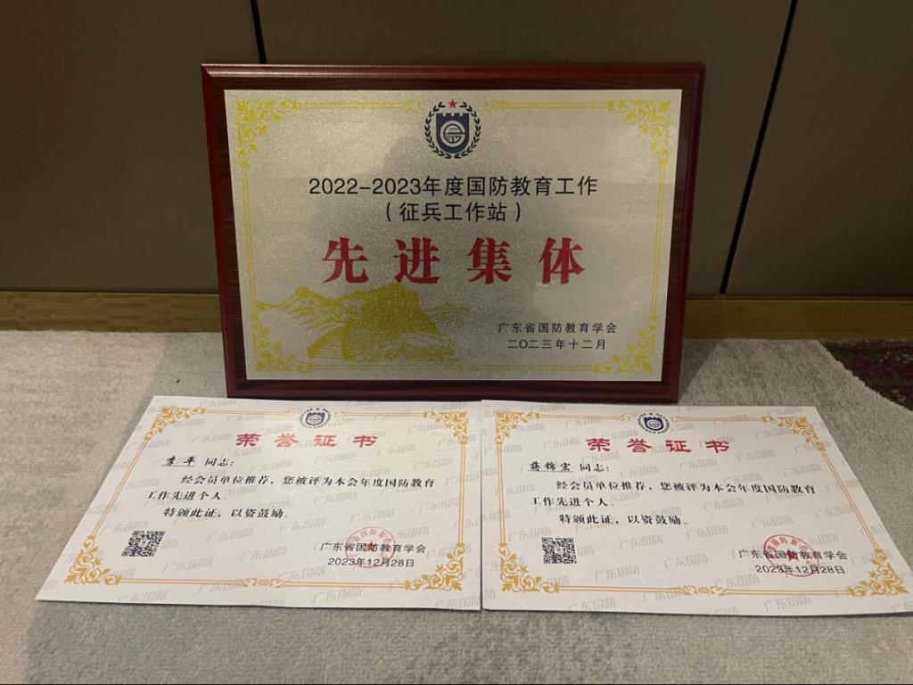 2023年度,我校还荣获多项省厅组织的国防教育系列活动荣誉,如国防教育专题短视频展播活动高校优秀组织奖、广东省学生军事训练营团体二等奖、国防教育工作先进单位、军事理论知识竞赛指导老师一等奖等。