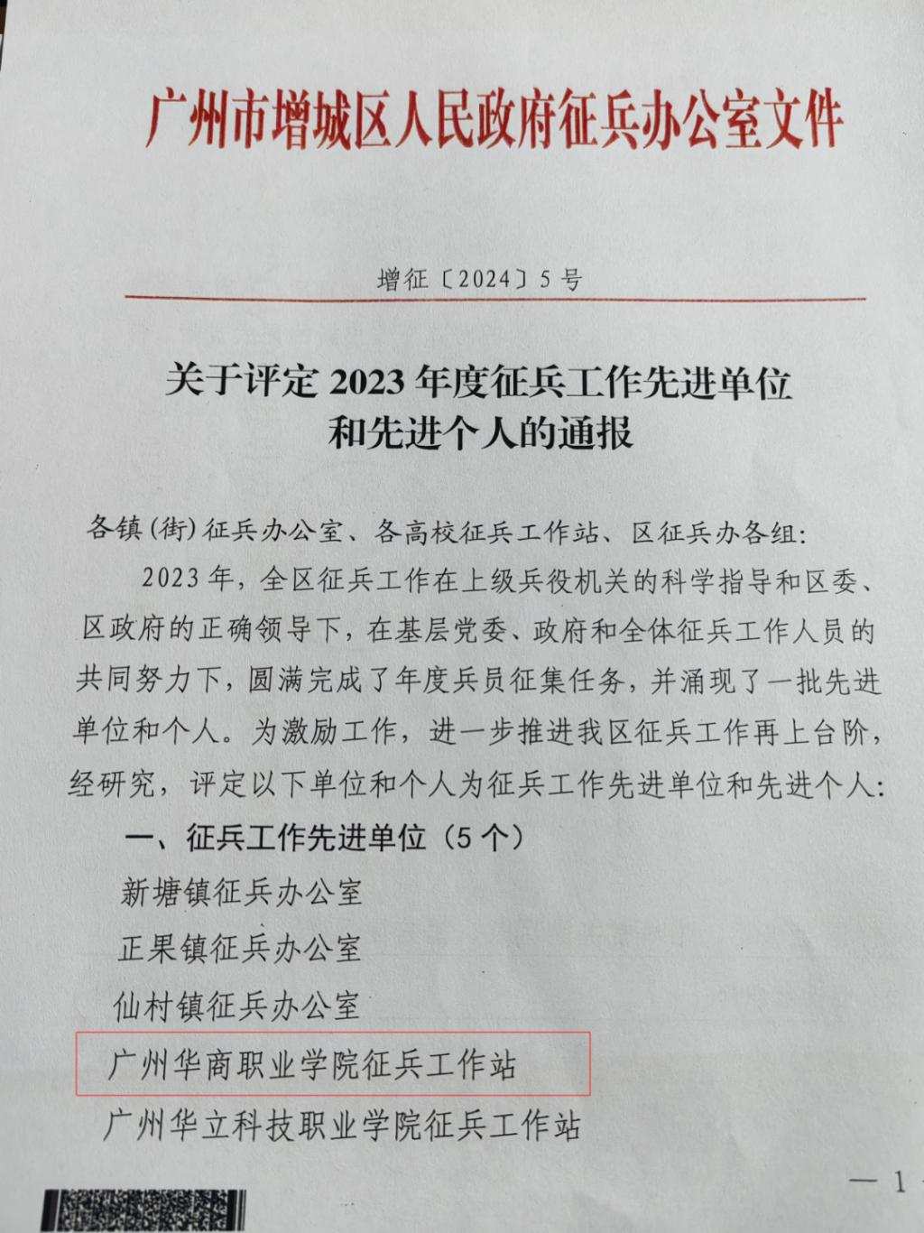 2023年,我校征兵工作成绩突出,被评为2023年度增城区征兵工作先进单位!