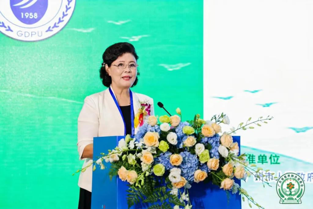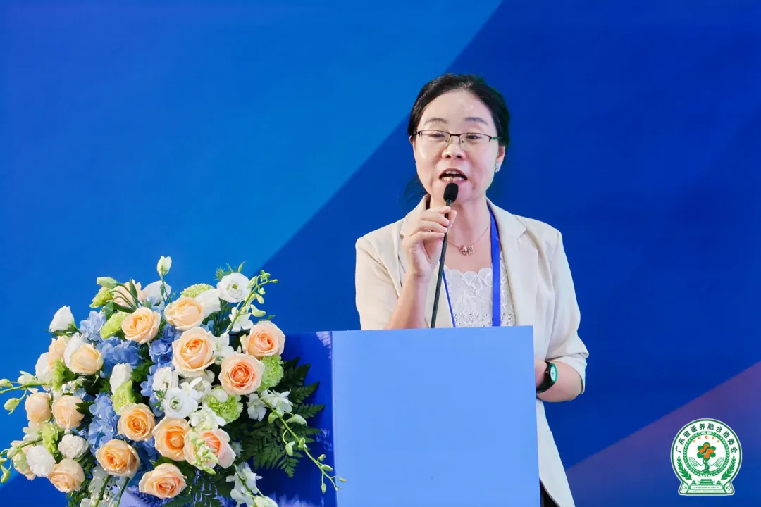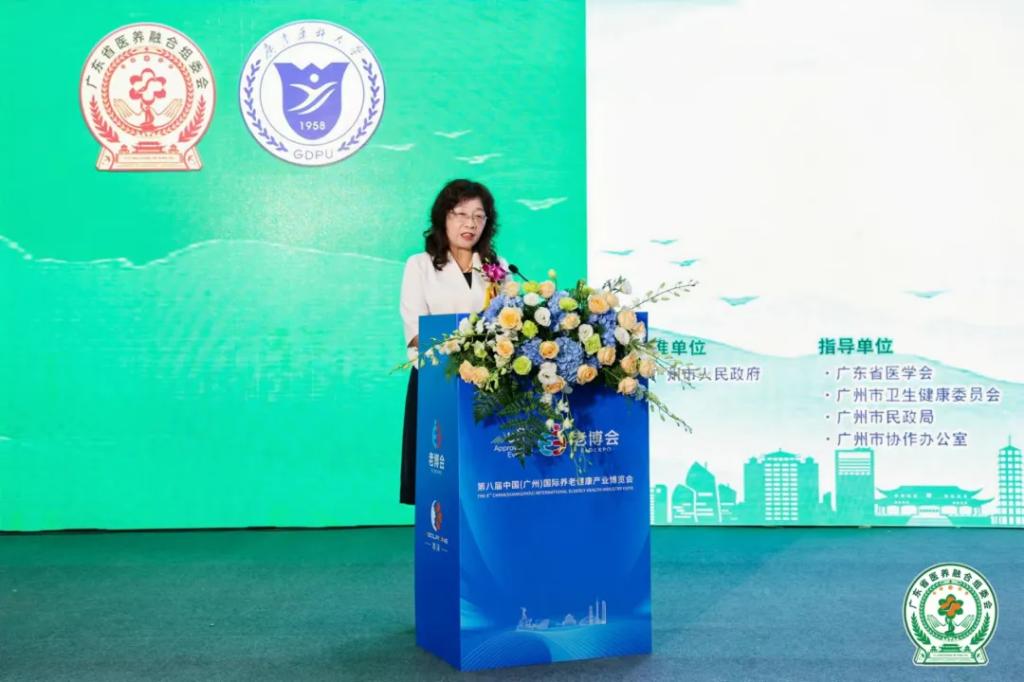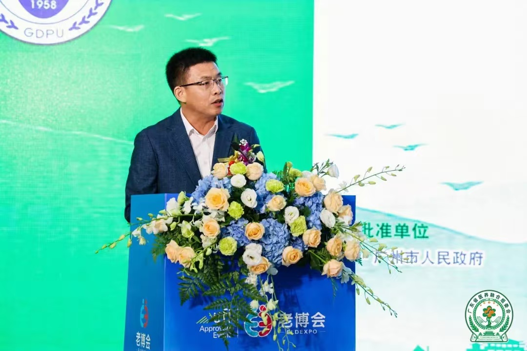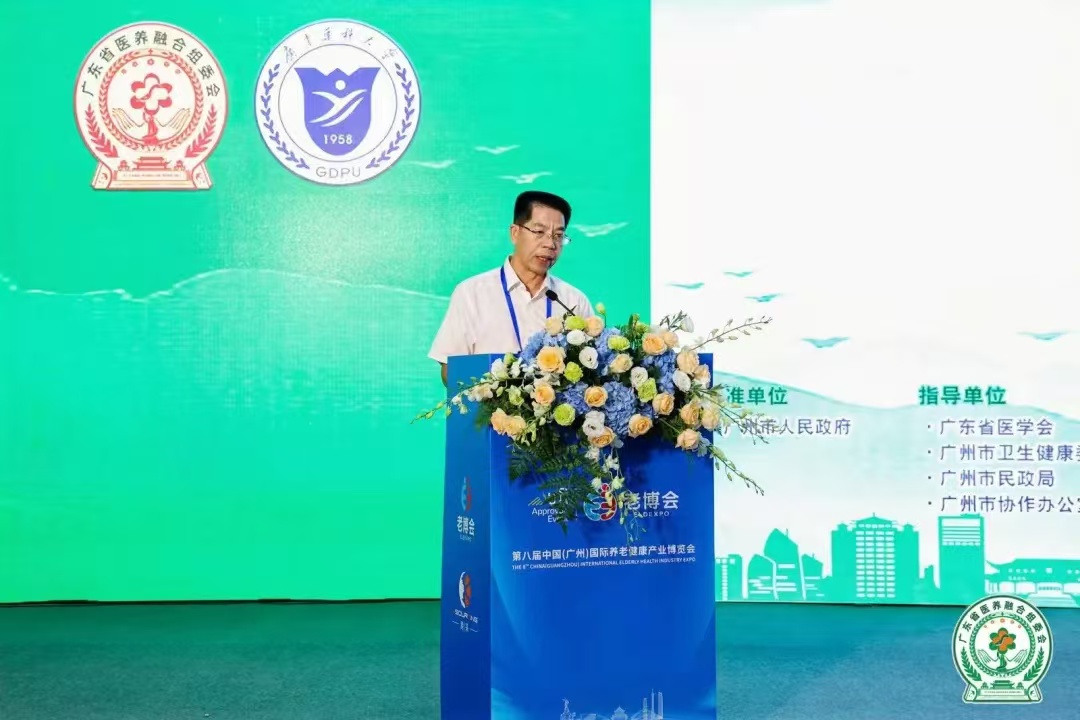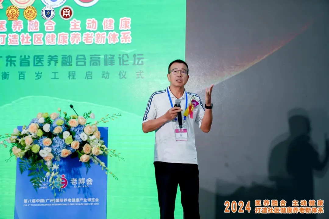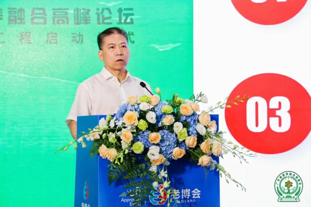 广东省卫生健康委老龄健康处处长马建致辞。他指出,当前养老问题备受社会关注,健康养老尤为重要,医养结合是实现这一目标的关键途径。