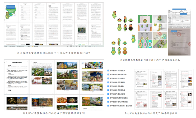 她所带领的团队成员依托项目基础,为韶关市浈江区新韶镇大陂村乌龟合作社的农文旅项目进行持续的服务。团队为合作社分别完成了:3万+字的商业计划书,商业计划书在与大陂村长期磨合的过程中不断优化,学生团队借助服务项目参加了“挑战杯”和“互联网+”的创新创业竞赛,分别获得了省赛铜奖和校赛二等奖;完成了1份露营基地项目策划书;设计了2个IP形象(归归、米米),申请专利并授权给合作社使用;8份文创实物;10份研学教案;1份宣传手册;8个宣传视频。该项目团队被评为2023年全国大中专学生“三下乡”社会实践活动之乡村振兴“笃行计划”专项行动全国示范性团队。