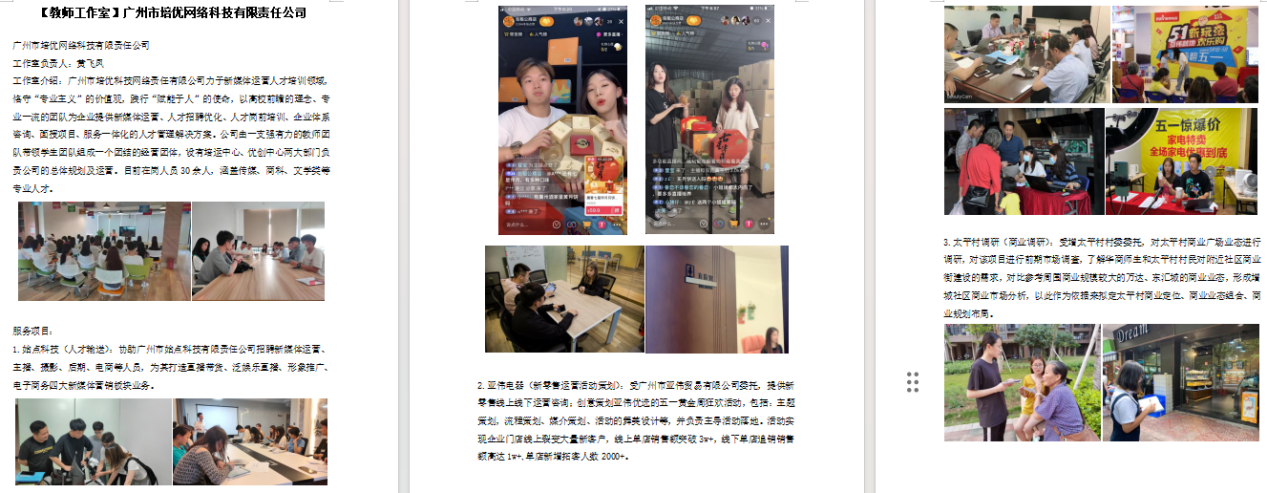 为帮助更多有创业意愿和积极参加社会服务的同学,黄老师在学校政策的扶持下,2021年创办了广州市培优网络科技有限责任公司,她通过系统专业的专业培训,协同学生为校内的彝之灵医美馆、眼镜店、多家餐饮店;校外的丰创供应链(广州)有限公司、亚伟“就地优先”、太平村村委、广州市增城包租公商店等十几家企业和门店提供活动策略、商圈及店铺规划、活动落地等多项服务。