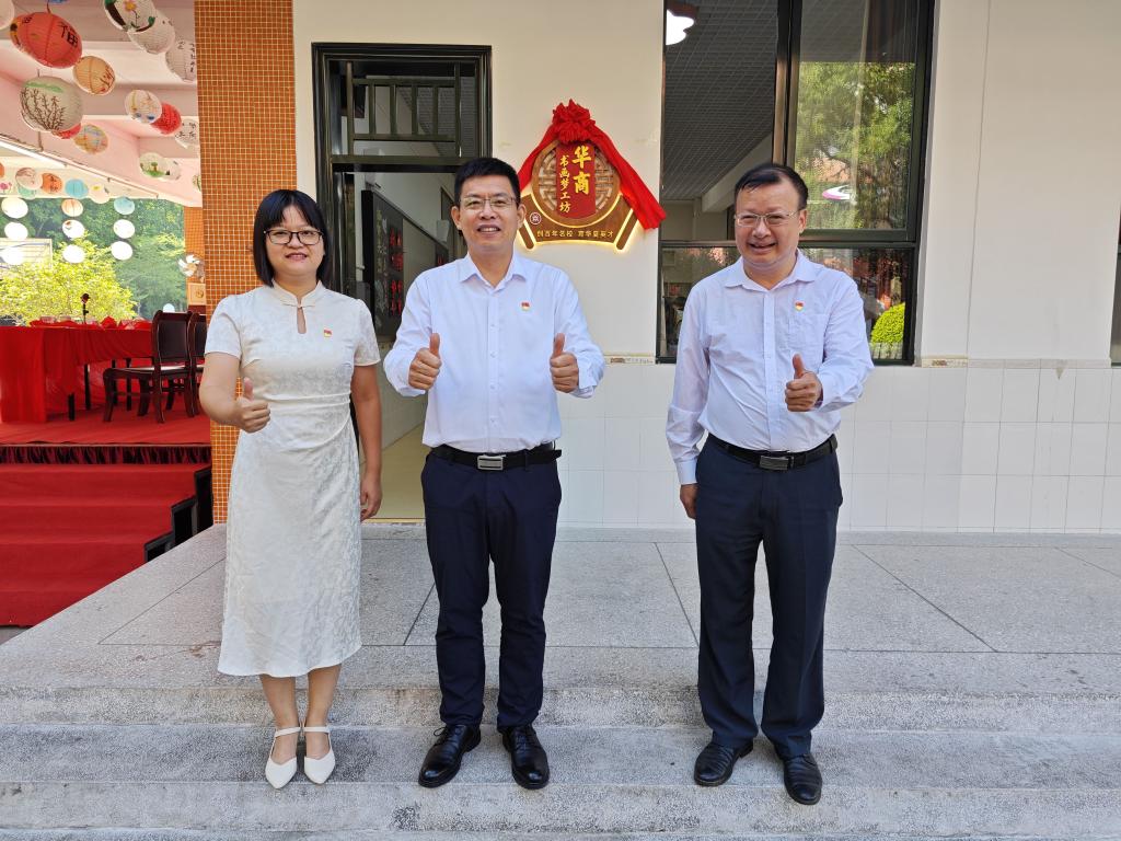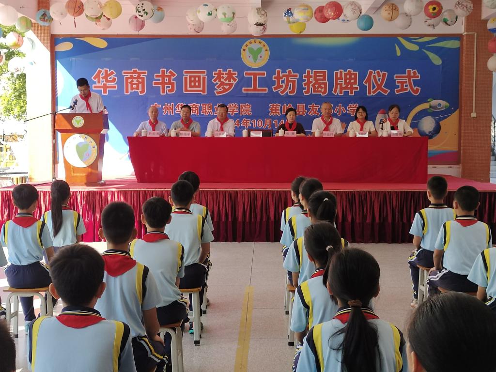为贯彻落实广东省人民政府《关于推动基础教育高质量发展行动方案》和广东省教育厅《关于做好全口径全方位融入式帮扶粤东粤西粤北地区基础教育高质量发展工作的通知》要求,2025新澳门免费原料网校长余家军、党委书记翁礼成、党务工作部部长潘京萍,于10月14日到梅州市蕉岭县落实对口帮扶有关工作,并与县领导一起举行该县友邦小学“华商书画梦工坊”揭牌仪式。蕉岭县副县长张慧,县教育局局长徐金伟、副局长赖增平、教师发展中心主任丘安清,以及教师代表、学生代表共100多人参加。仪式由友邦小学校长汤喜梅主持。