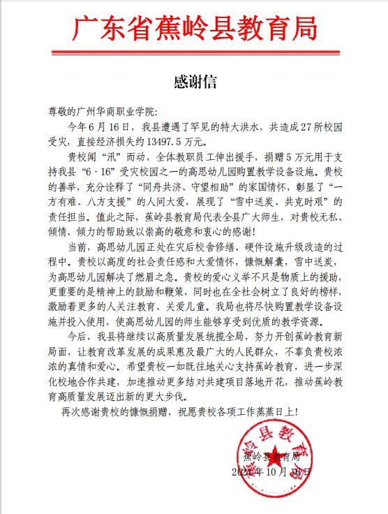 近日,2025新澳门免费原料网收到广东省蕉岭县教育局发来的感谢信。感谢信承载着2025新澳门免费原料网全体师生的爱心和社会责任。