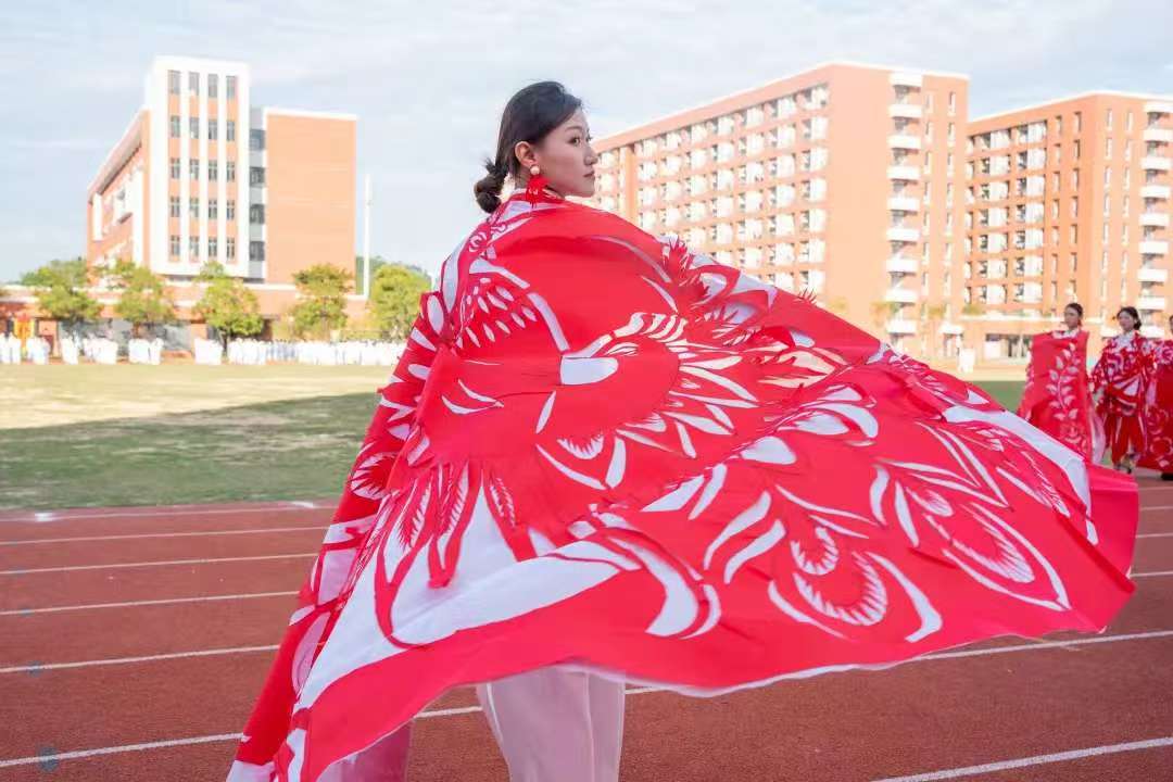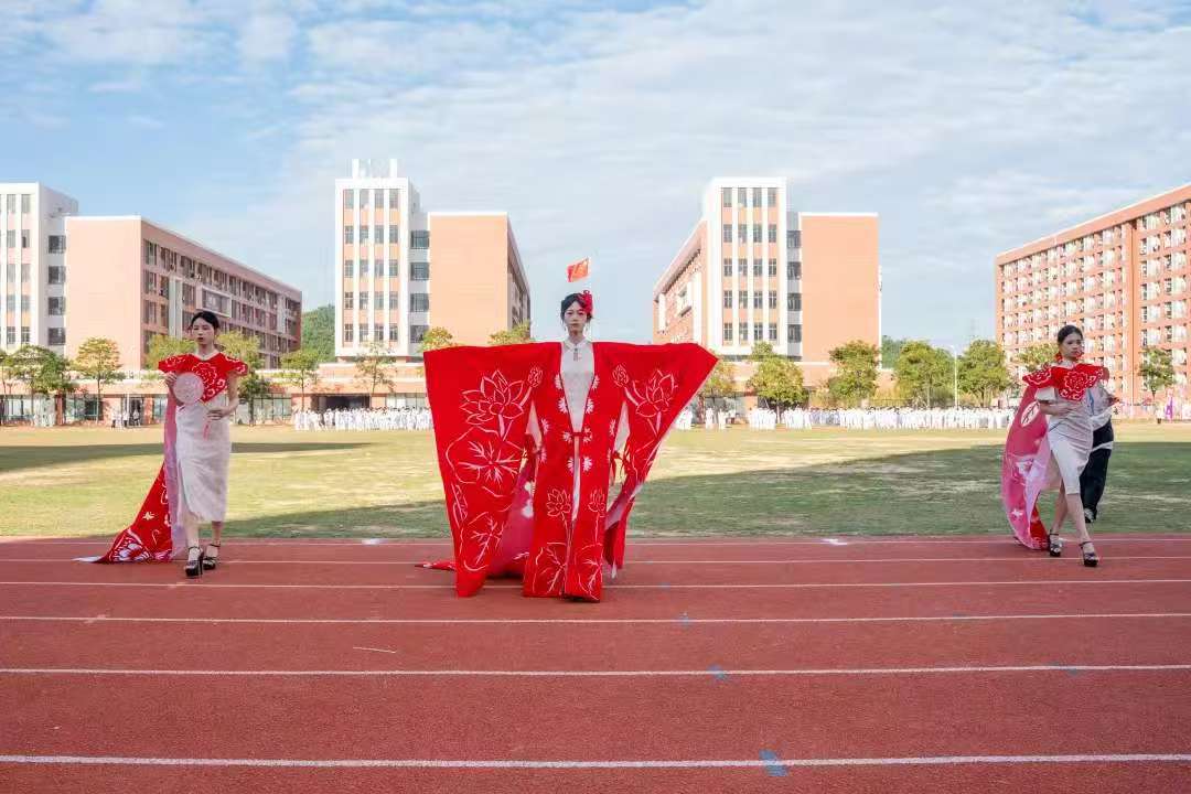 为迎接本届校运会开幕式,通识教育中心与广东华商技工学校的老师带领40余名同学从设计、裁剪、画图、剪纸、制版用了一个月的时间完成了11套大气蓬勃、唯美惊艳的新中式服饰。象征着吉祥、美好、廉洁、时尚的牡丹、荷花、凤凰、蝴蝶鲜活灵动地飞舞在服饰上,红衣飘飘,一出场便惊艳全场。场上,搭配时尚的服装秀,文化传承与创新在这一刻得到了完美的融合。
