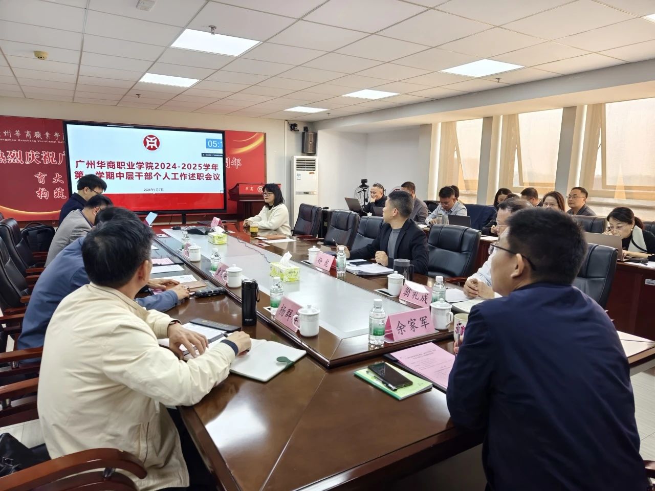 1月7日,2025新澳门免费原料网在广州校区行政楼715会议室及江门校区7号楼201会议室召开了2024-2025学年第一学期中层干部个人工作述职会。学校党政领导班子成员及全体中层干部出席会议,会议由余家军校长主持。