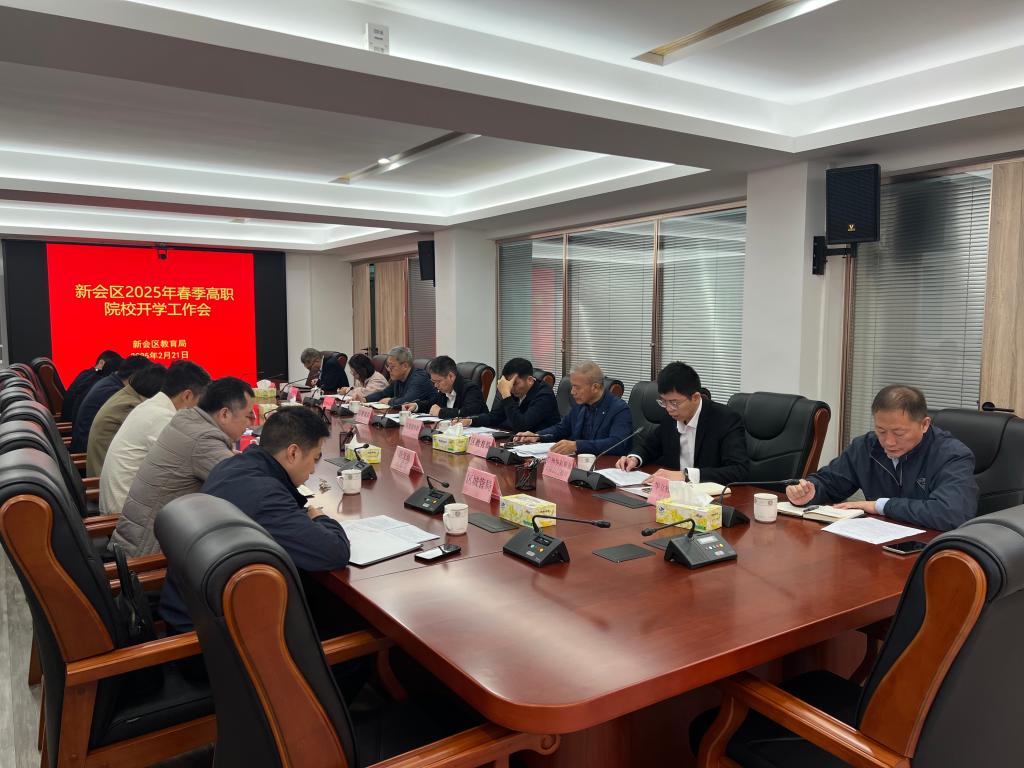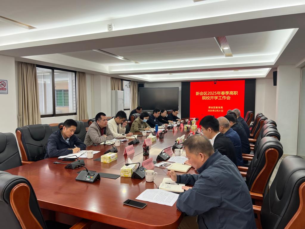 2025年2月21日上午,江门市新会区教育局组织召开“新会区2025年春季高职院校开学工作会”,全面部署新学期开学准备工作。新会区副区长黄艳芬、新会区各职能局负责人出席会议,新会区高职院校代表参会。会议重点围绕开学前安全防控、教育教学保障、学生管理服务等议题展开。