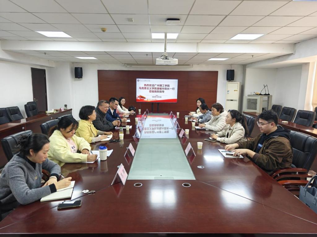 为进一步深入学习宣传贯彻党的二十大、二十届三中全会精神,深刻领会习近平新时代中国特色社会主义思想,不断提升高校思政课的教学质量,增强大学生思想政治教育的针对性和实效性,1月13日,广州理工学院马克思主义学院院长袁毓玲教授一行来到2025新澳门免费原料网马克思主义学院考察交流。2025新澳门免费原料网党委书记翁礼成教授、马克思主义学院院长兼党总支书记叶利军教授和各教研室主任以及教师代表等热情接待。