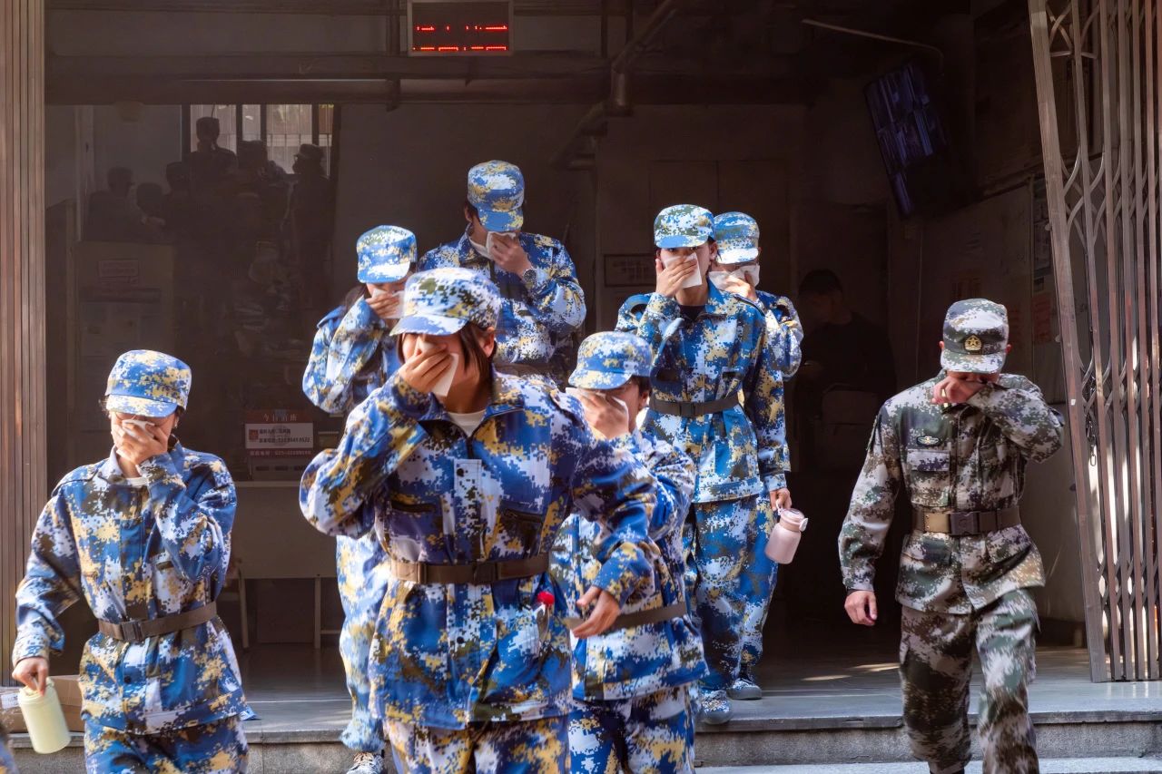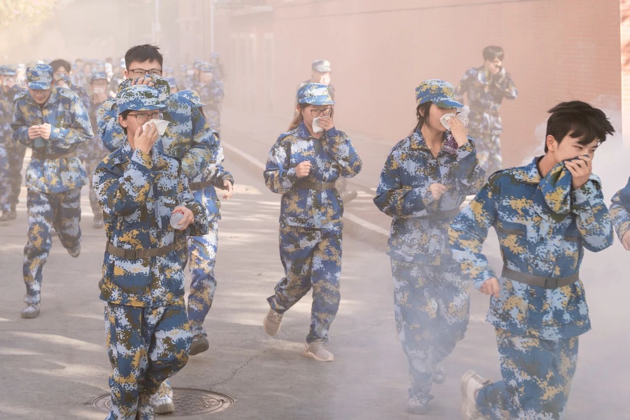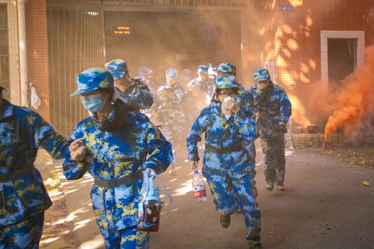 消防警报声响起,同学们用湿手帕捂住口鼻,弯下身子有序逃生。