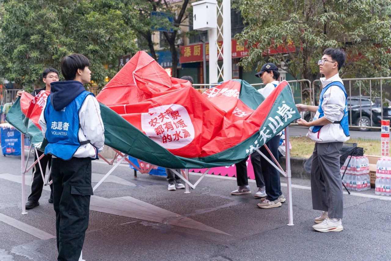帐篷搭好后志愿者迅速将早已准备好的补给物资搬运进来,按照饮用水、水果、小食品等分类摆放整齐,每个细节都倾注了他们对选手的贴心关怀,只为打造一个个温馨的 “补给港湾”。