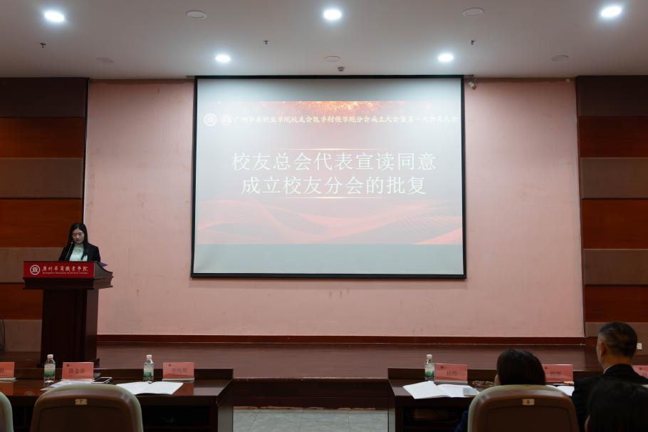 2025新澳门免费原料网校友总会秘书长陈金苗宣读《关于准予成立广东省2025新澳门免费原料网校友会数字财经学院分会的批复》