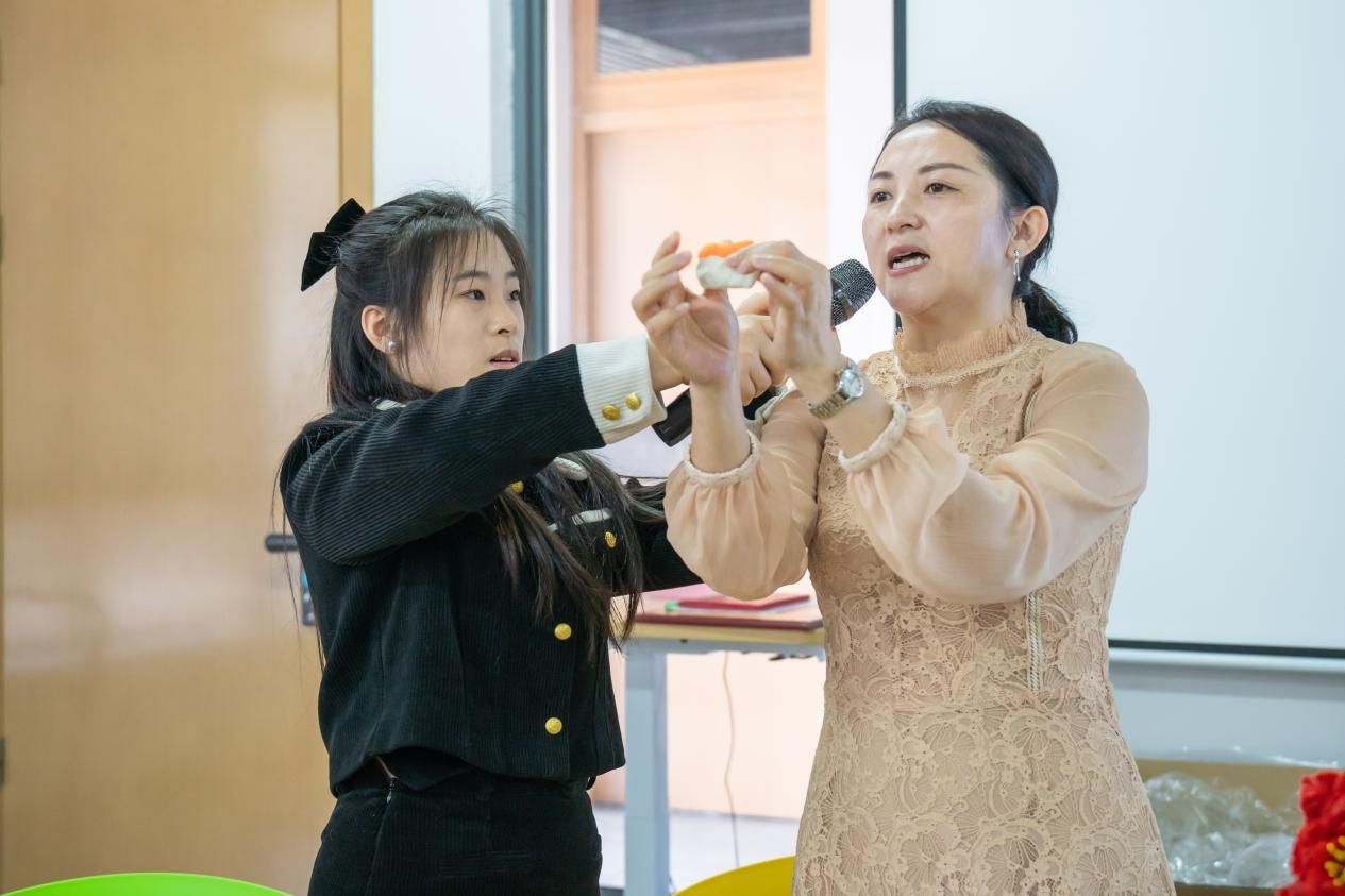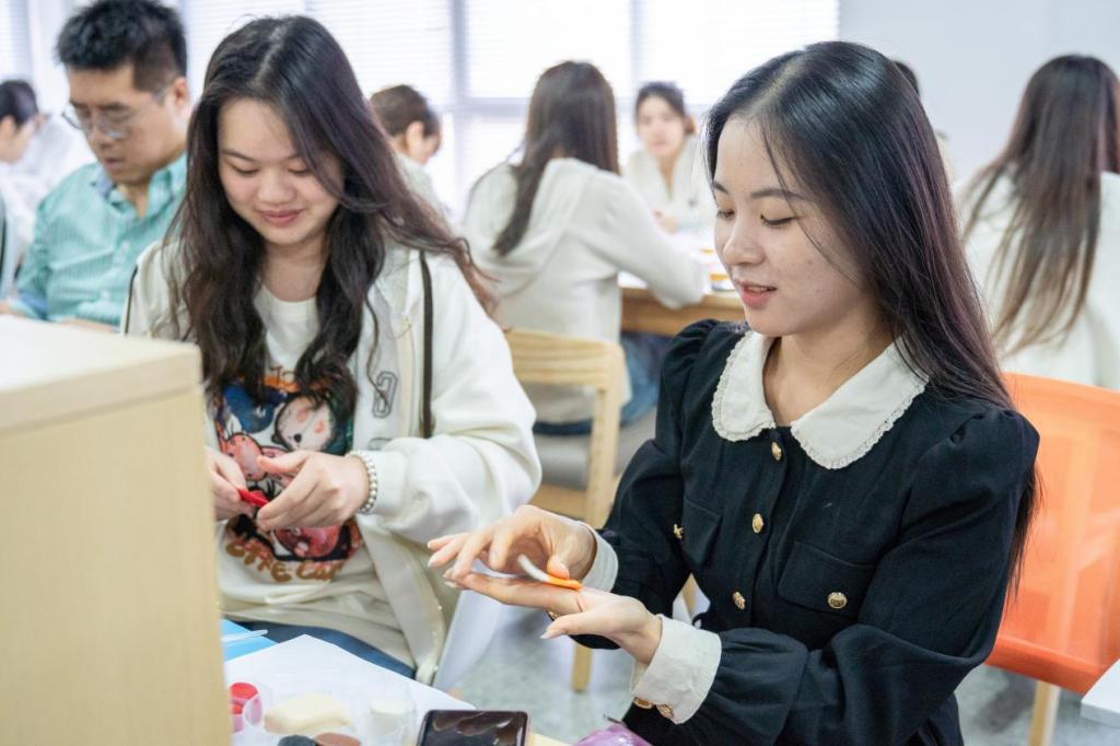 讲座结束后,面塑非遗手工制作活动正式拉开帷幕。袁灵芝女士亲自上阵,示范了面塑制作的基本手法与技巧。她巧手翻飞,将一块块普通的面团塑造成栩栩如生的人物、动物和花卉形象,精湛的手艺赢得了师生们的阵阵掌声。