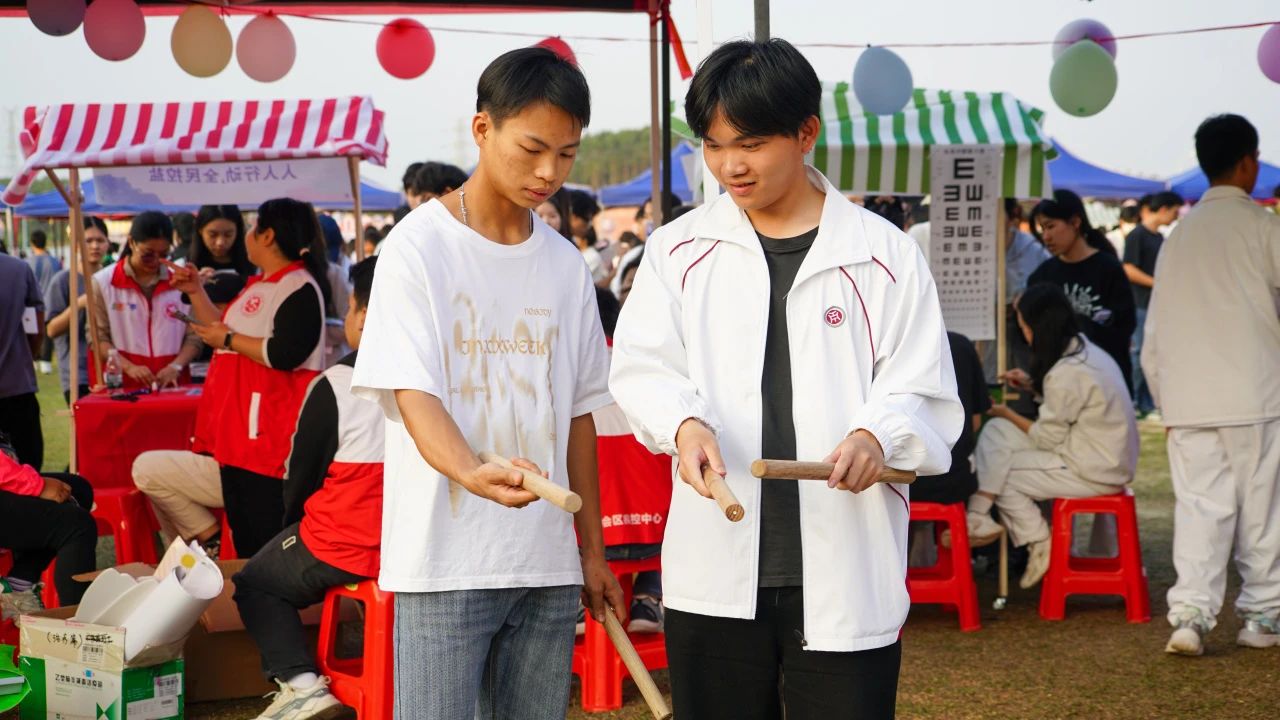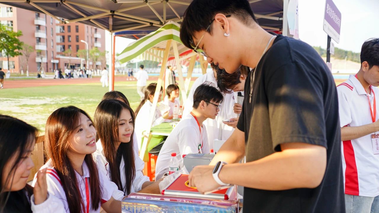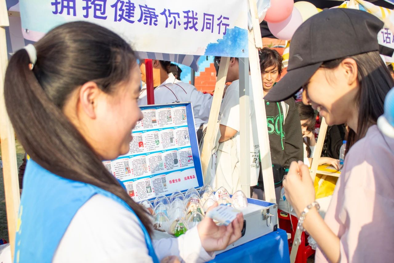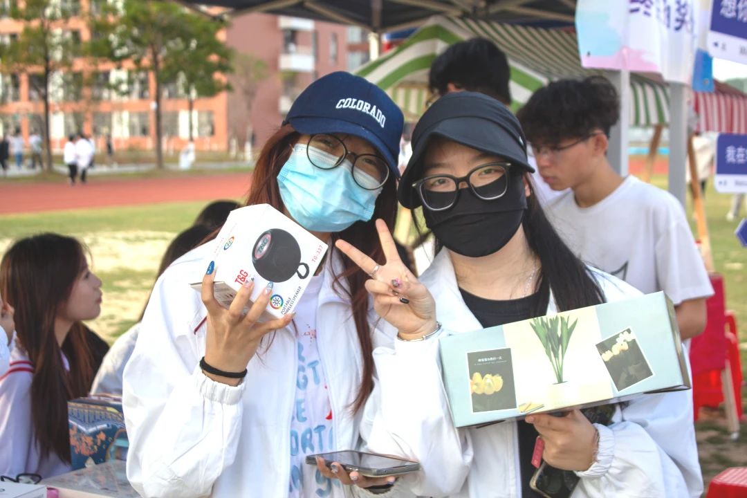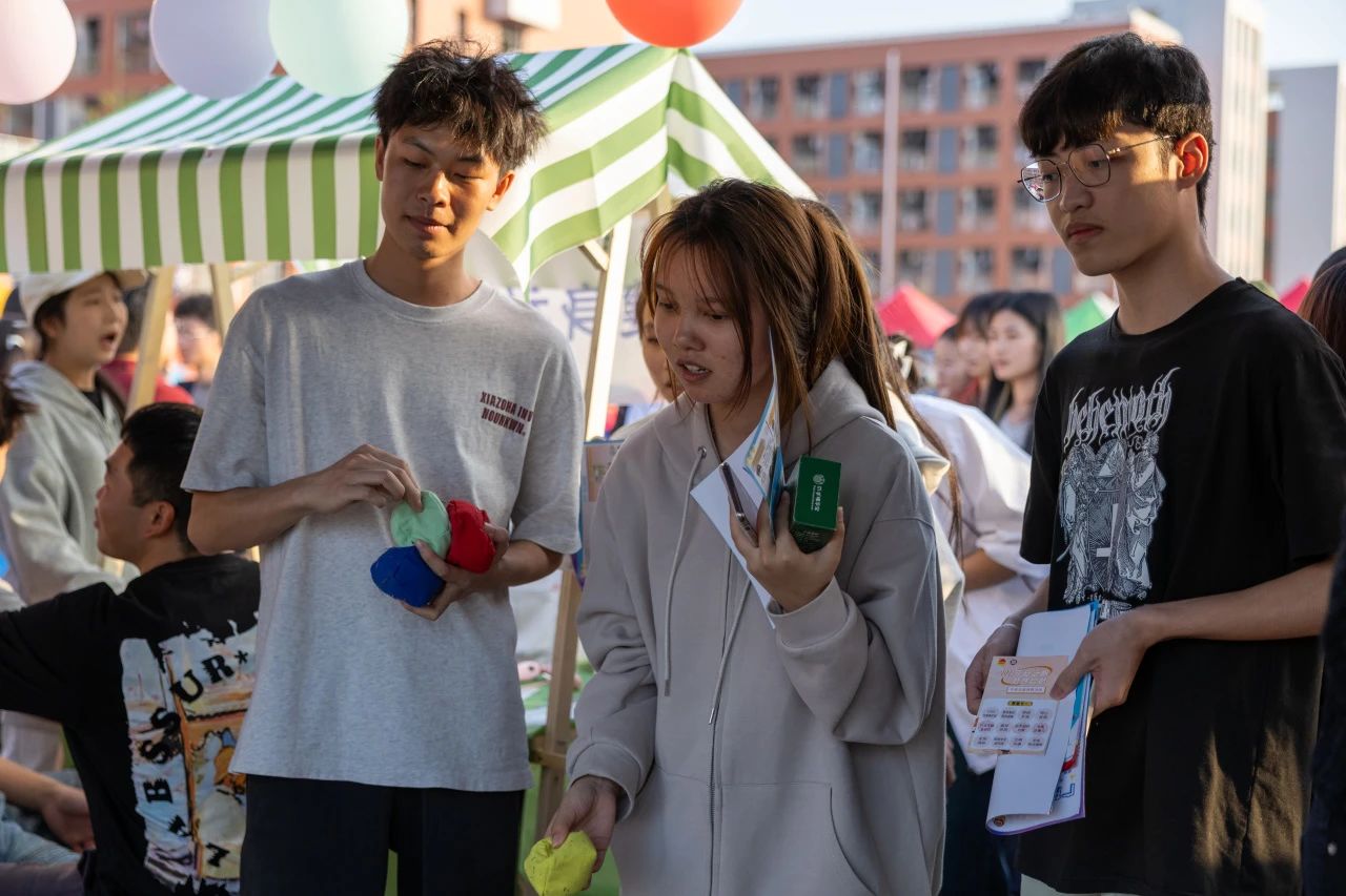 学生社团心连心,摆摊有序齐配合,摊位不大,趣味无限,知识在游戏中传播。