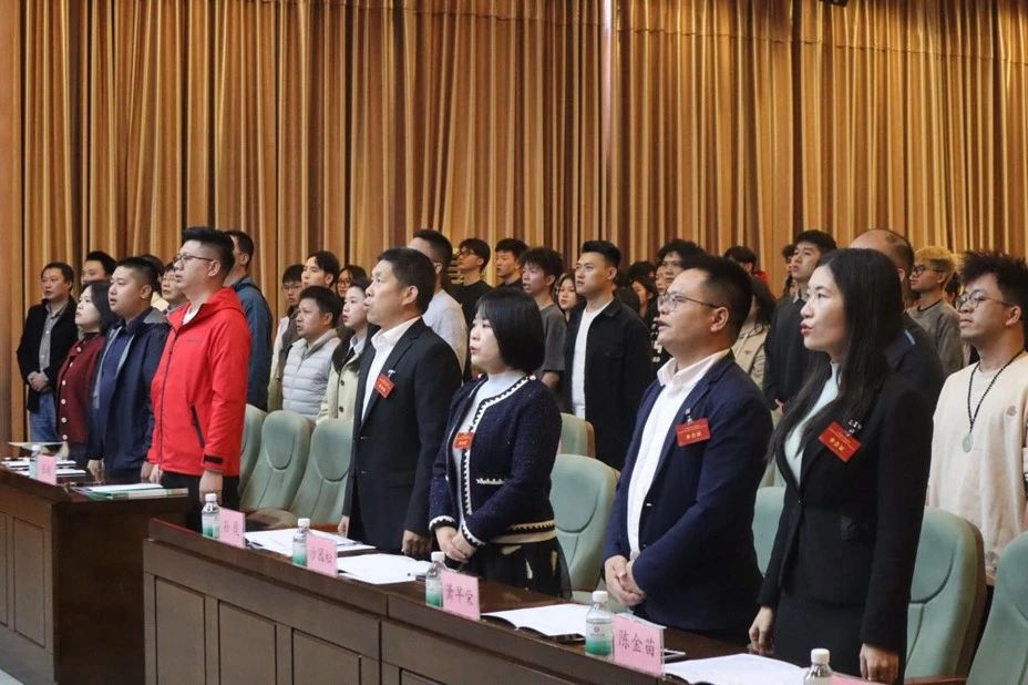 校友分会成立大会在庄严的国歌声中拉开帷幕,全体与会人员齐声高唱国歌。