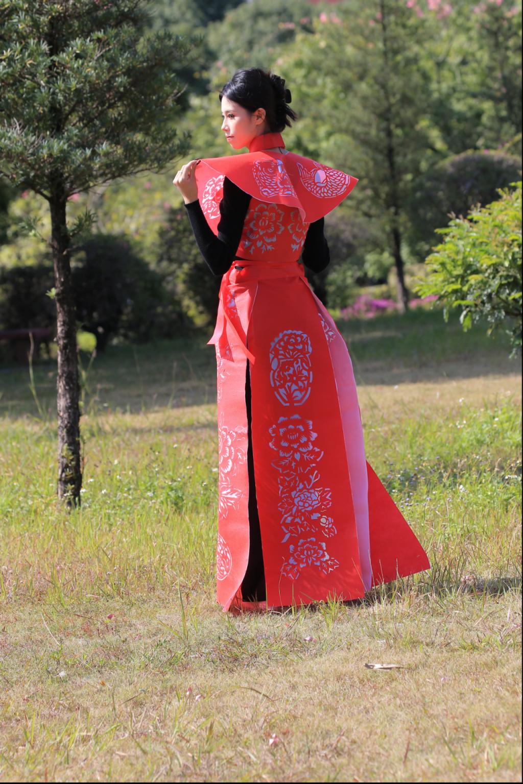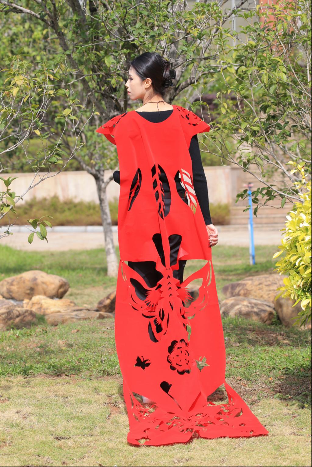 经过师生不懈努力与探索,11套华美绝伦的服装作品精彩亮相。这些作品通过独特的剪裁手法,每一件都展现出流畅而富有层次的线条美;精致的图案设计不仅细腻地刻画出了剪纸艺术的独特韵味,更赋予了服装以深厚的文化内涵,令人叹为观止。