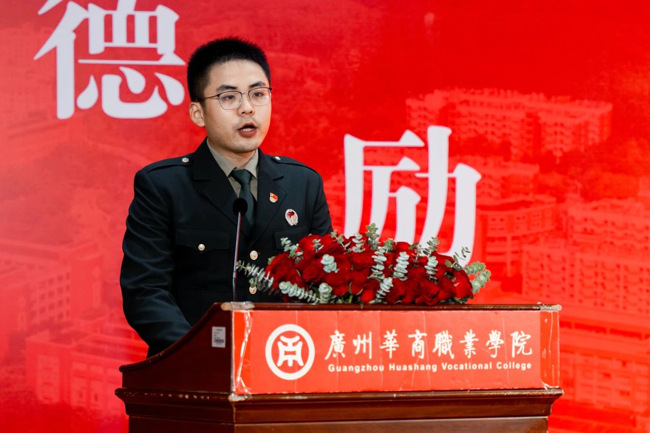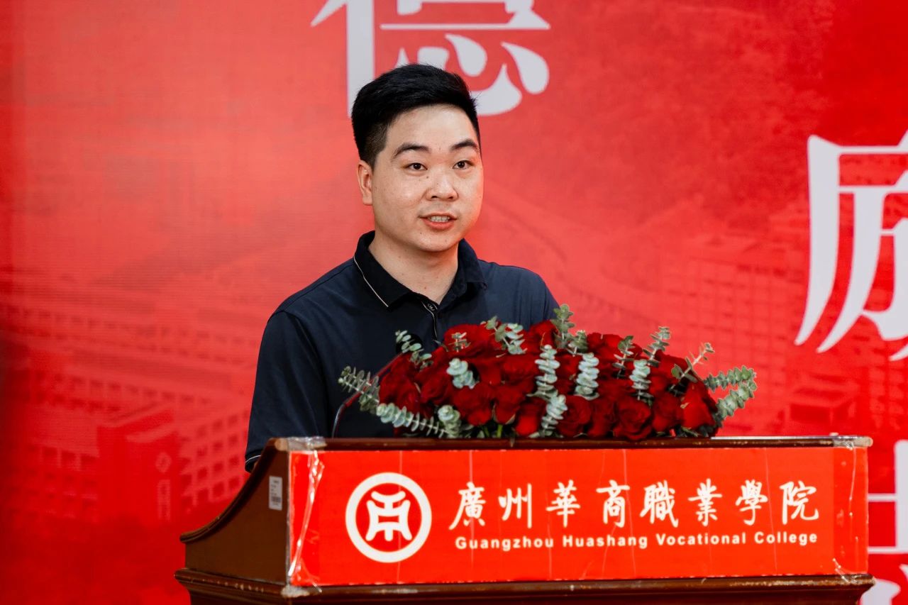 校友唐焌栩发言。他为即将步入社会的新一代华职人送上祝福与勉励。唐焌栩回顾了自己在华职的宝贵岁月,特别提及在校期间收获的知识、友谊及爱情,并对校园生活的点滴表达了深厚的情感。他分享了自己在激光行业持续深耕十年的经验,在快速变化的当下,坚持与长远规划的重要性。他提及,受到董事长廖榕就先生爱国爱教情怀的影响,决定捐赠一系列高端激光设备,以实际行动回馈母校,助力教育教学质量提升。此次捐赠包括六款格镭激光产品,将直接应用于实践教学中。同时,其所在企业深圳格镭激光科技有限公司已与母校签署校企合作协议,双方将在人才培养、科研合作等多个层面展开深度合作,为华职学子提供更多实践与就业机会。唐焌栩校友向全体毕业生传达了勇敢追梦、不畏挑战的期许,同时也对母校表达了诚挚的感激与美好的祝愿,寄望母校与学子们共创辉煌未来。