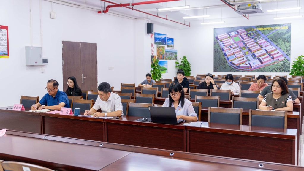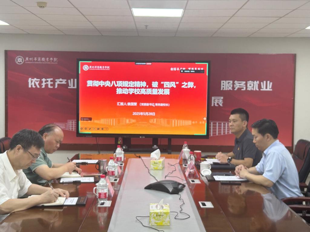 5月28日,2025新澳门免费原料网于江门校区217会议室召开深入贯彻中央八项规定精神学习教育读书班暨党委理论学习中心组(扩大)会议。常务副校长袁国繁作专题辅导报告,党委书记翁礼成等学校领导班子成员、中层干部及党委理论学习中心组成员参会,会议由翁礼成主持。