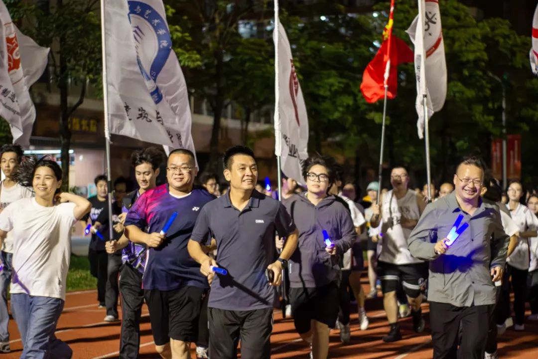 压轴登场的是超有意义的师生夜跑400米。书记、校长和老师们亲自领跑,站在了起跑线上,随着发令声响,师生们迎着习习晚风,在璀璨的灯光和全场的加油声中奋力奔跑。