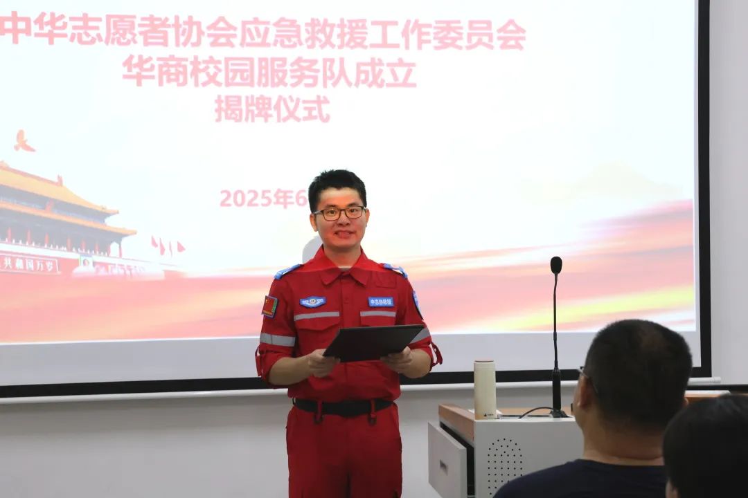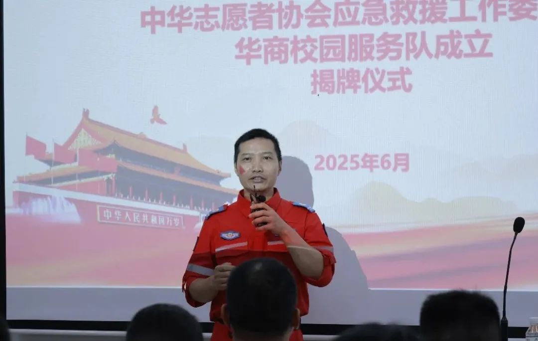华商校园服务队队长黄长荣代表全体队员向学校领导、老师及中华志愿者协会致以感谢,他表示应急救援队伍肩负着守护校园安全、保障师生生命健康的神圣使命,需要始终以“专业为本、团结为基、服务为魂”为准则,积极参与安全宣传教育,用实际行动践行担当。