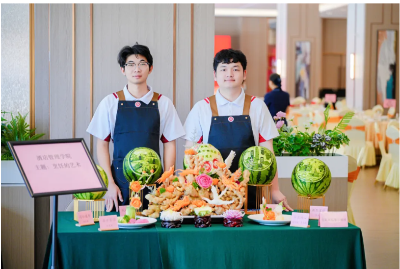 酒店管理学院设置三个摊位:现场演绎荔枝酒创意调制;象形石榴包、软欧包等特色面点展示;食品雕刻工艺展示,以西瓜雕刻庆祝香港回归28年、“姜山”造型寄意山河一统。