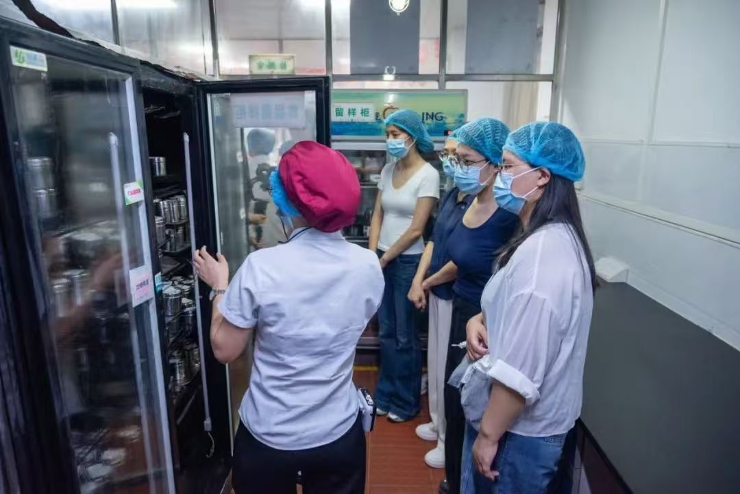 第一食堂经理现场演示食材溯源信息公示系统,强调“所有原料均来自合规供应商,票据齐全、源头可溯”;第二食堂洗消间内,餐具回收、浸泡、高温消毒至密封保存的标准化流程,以及留样冰箱中按日期封存的食品样本,均以可视化方式传递安全承诺。