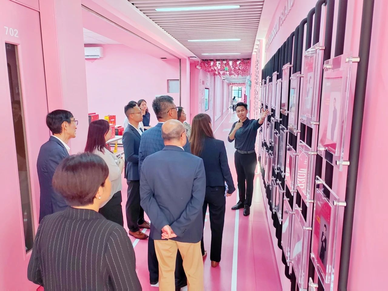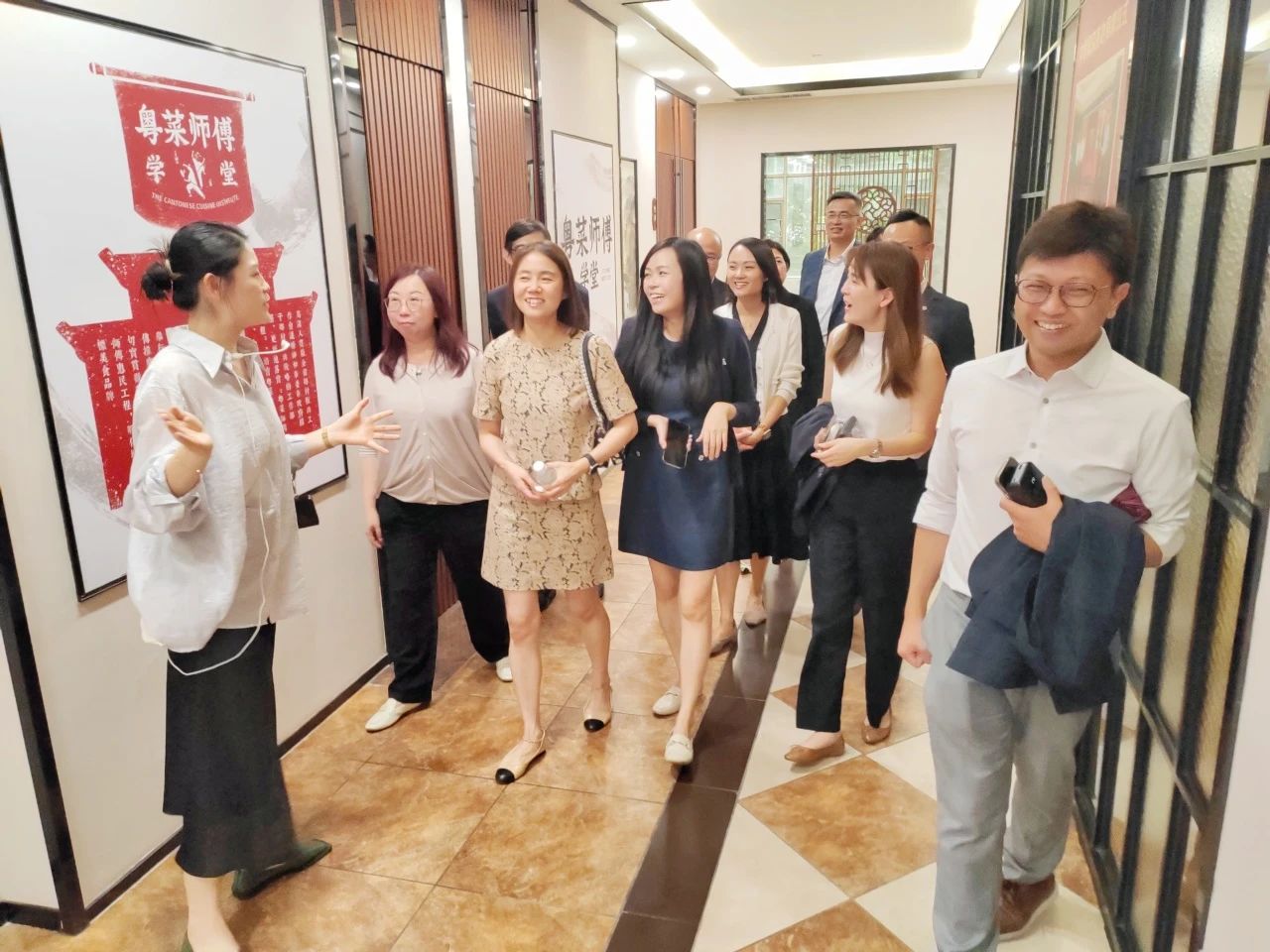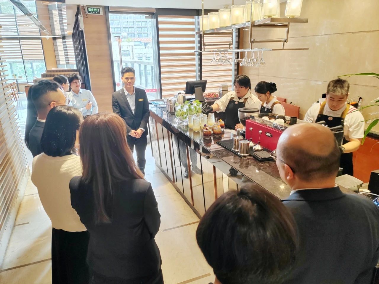 在太阳城附属教学酒店,代表团由“双岗”老师引导,参观了“酒水”“西厨点心”“前厅接待”等教学实训区,观看烹饪工艺与营养专业学生实操训练,并走访国际宴会厅、华商技能培训中心。在学校内,代表团参观了弘美餐厅、桃花岛电商直播基地以及中餐繁荣基地。