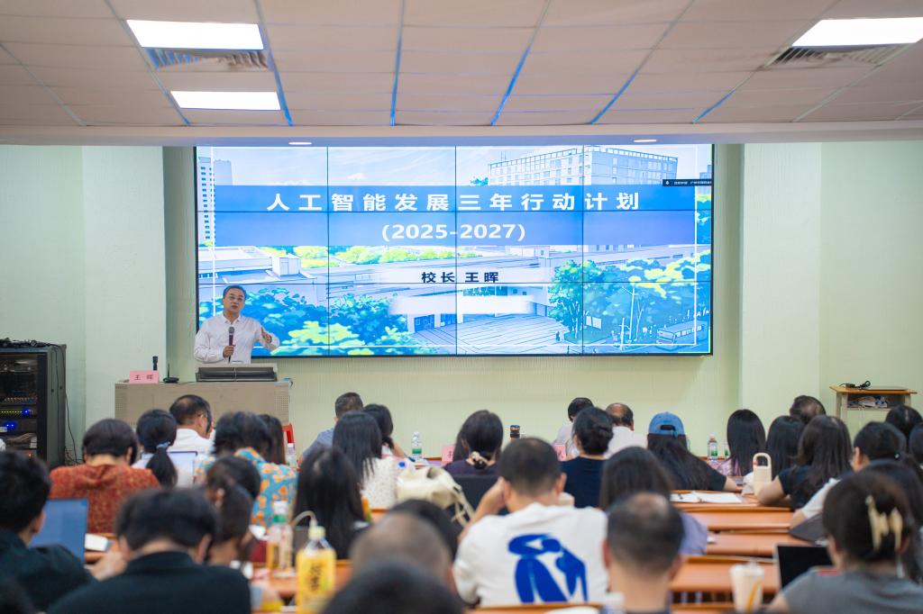 随后,深圳信息职业技术大学校长王晖教授以《人工智能发展三年行动计划》为主题,系统阐释了深圳信息职业技术大学以“强芯铸魂 增智培元 翔空通联 向未来”为战略导向的专业布局,并围绕这一布局拆解了九大主要任务——打造高水平人工智能专业群、人工智能全面赋能“两好两强”数智人才培养、建成全员“AI+教师发展”支持体系、构建一流人工智能科创体系、推动人工智能产教深度融合、深化人工智能泛在场景应用、提升人工智能社会服务水平、加强人工智能国际合作、夯实智慧校园领先数字基座。王晖教授还就每一项任务的目标拆分与主要举措进行了详尽的说明,通过具体案例、数据支撑与实施路径,全面展现了深圳信息职业技术大学在人工智能领域的创新实践与建设成果,为我校人工智能赋能职业教育发展提供了宝贵的启示与借鉴,激励着我们积极探索、勇于创新。