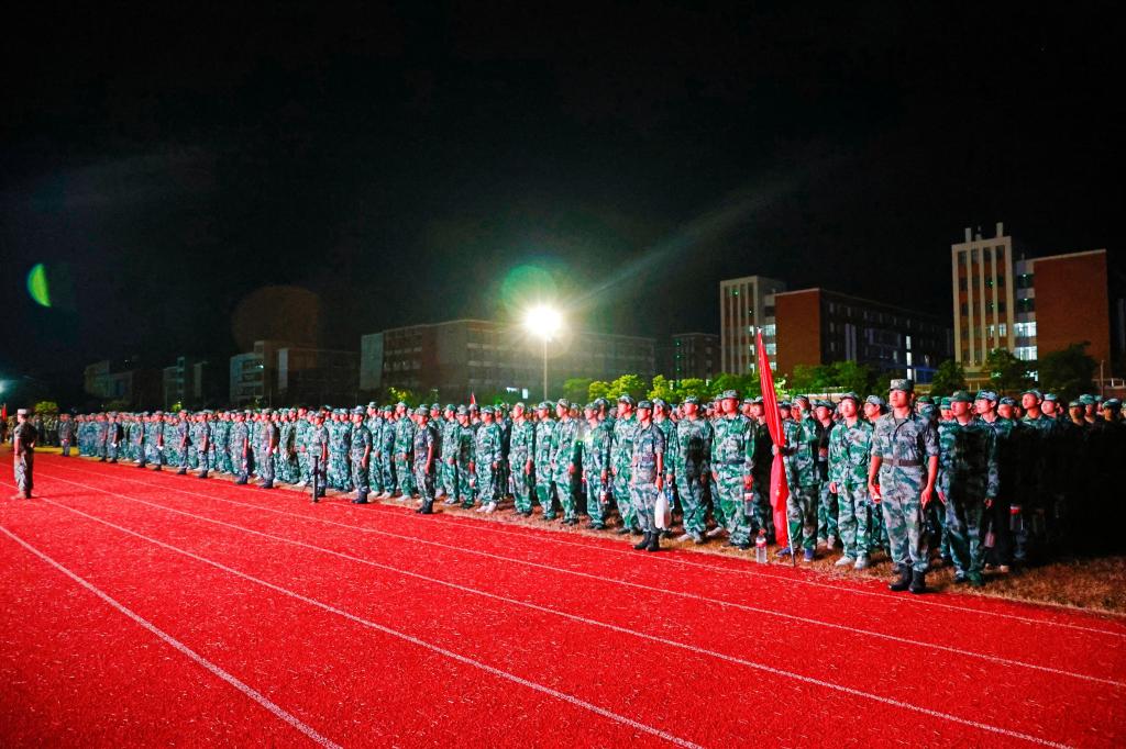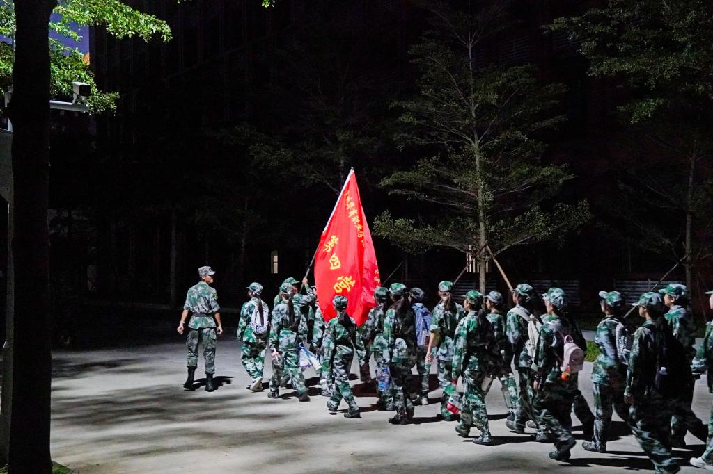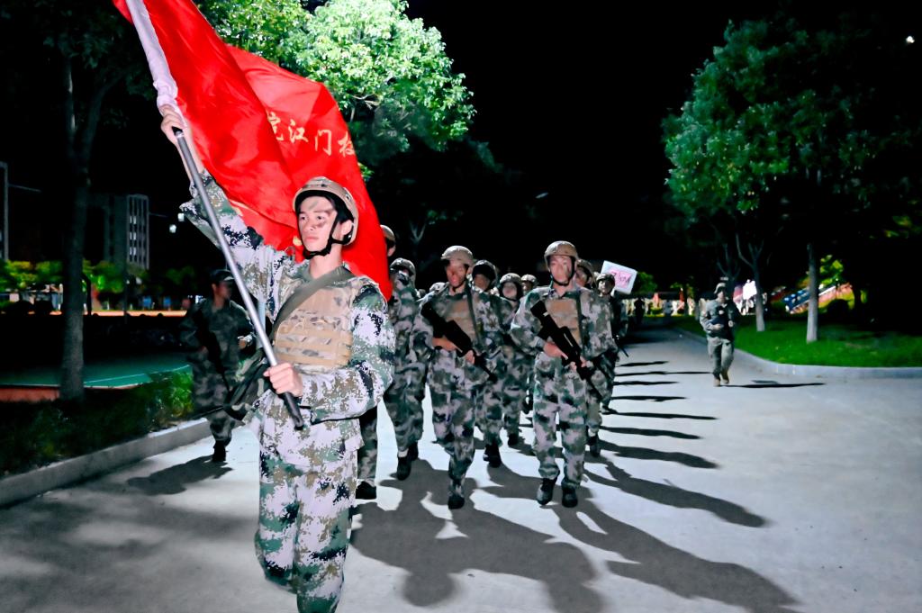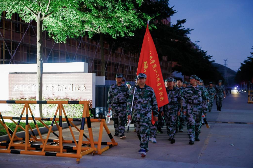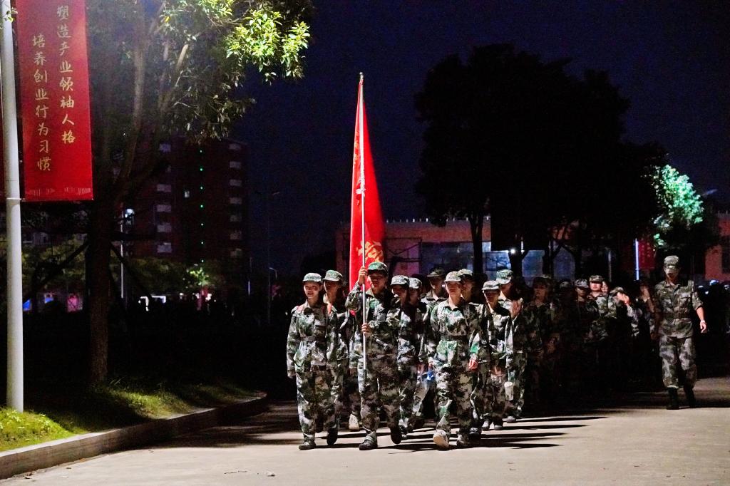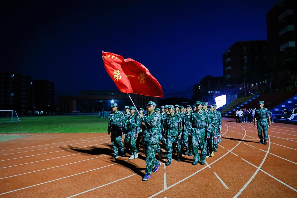 田径场上,5个营队依次完成集结汇报,新生们衣装笔挺地站成队列,蓄势待发。“出发!”副校长孙虎一声令下,嘹亮的行军歌声划破寂静的黑夜,队伍被歌声点燃,军心激荡,士气如虹,昂首阔步,有序前进。