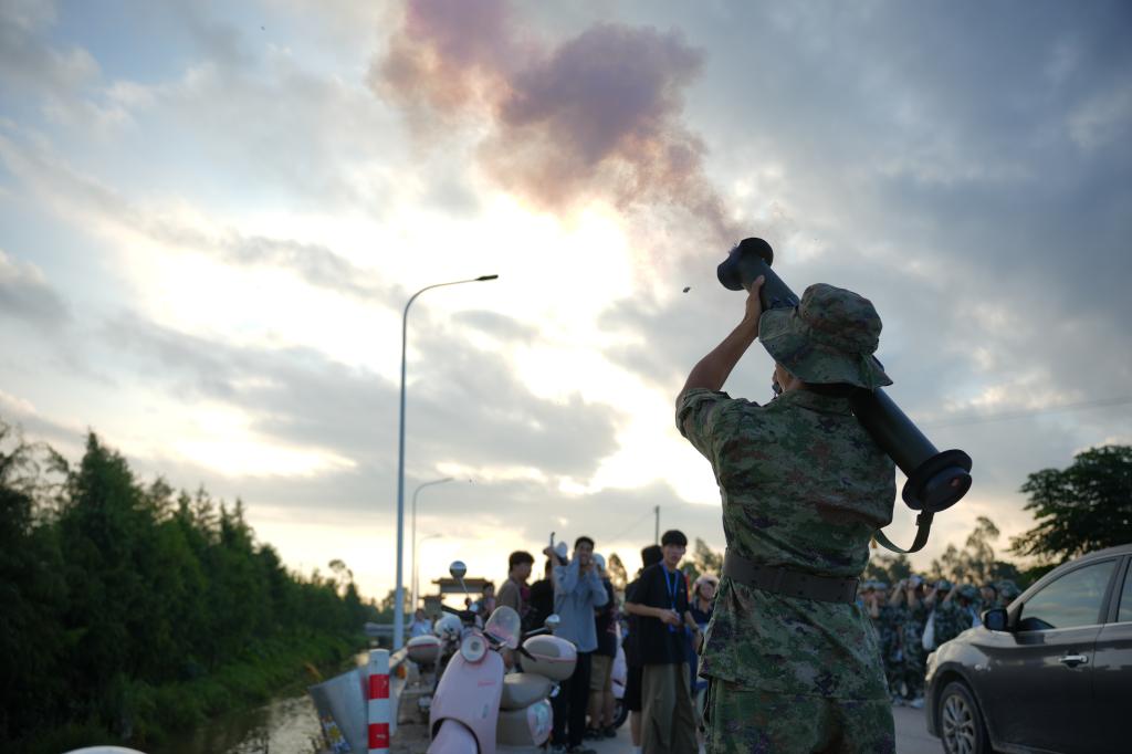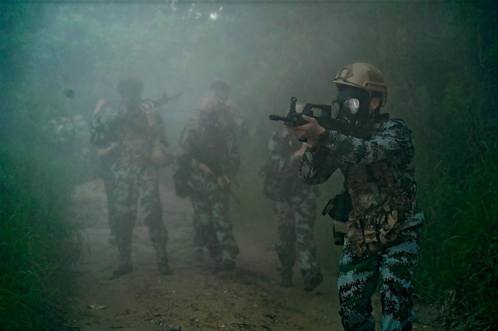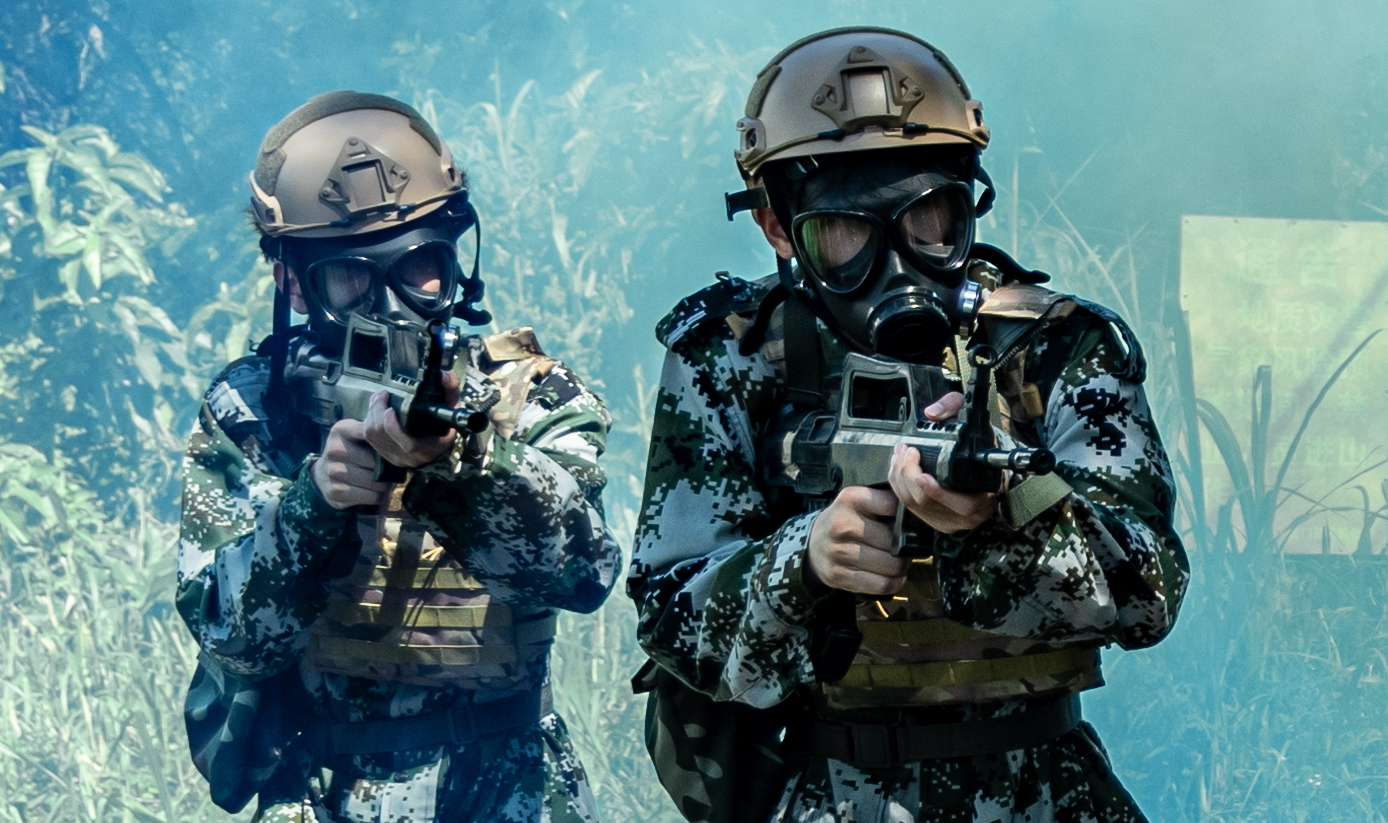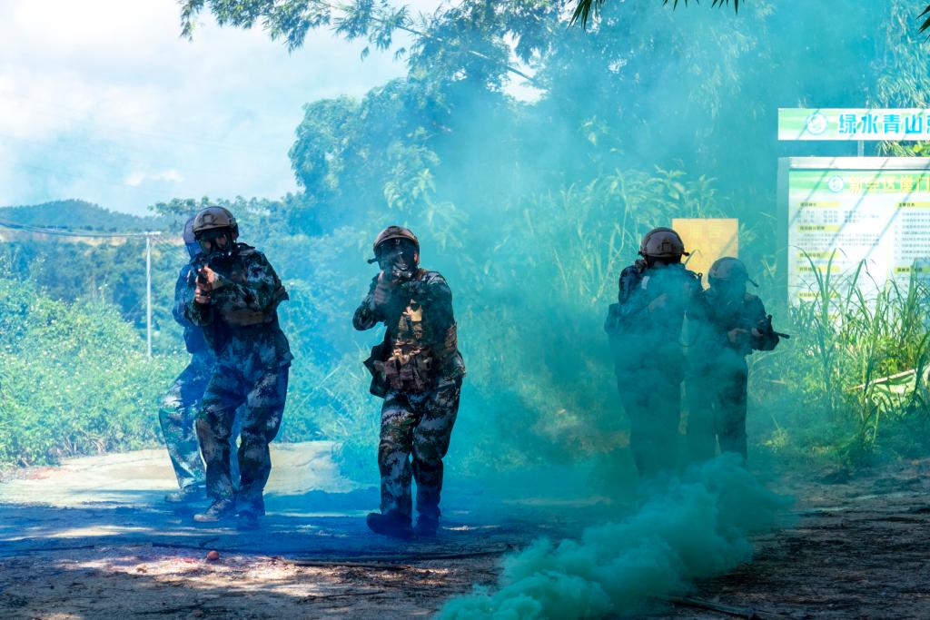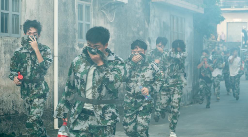队伍行进间,忽见前方浓雾弥漫,视线受阻。队伍进入了“染毒地带”。尖刀班立即拉响警报,行军队员们弯腰低姿快速通过染毒区域。