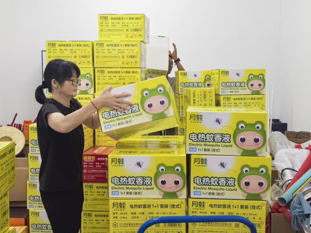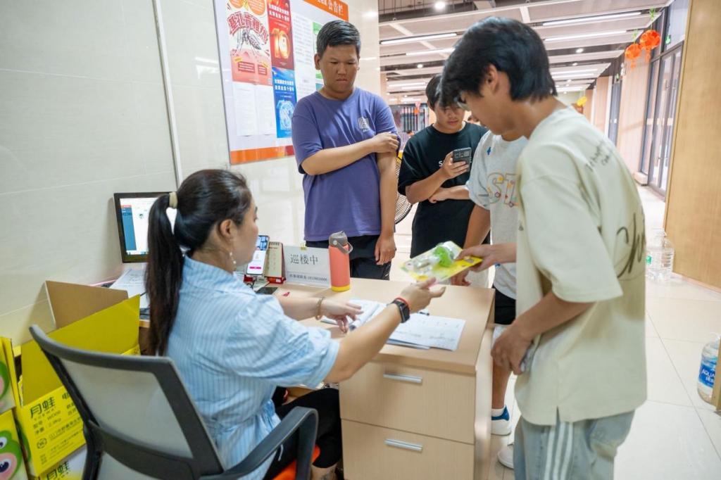 基孔肯雅热的传播离不开蚊虫媒介,做好个人与宿舍防蚊是防控首要环节。傍晚,各楼栋宿管员已在值班室完成蚊香液发放准备,一箱箱蚊香液按楼栋整齐码放,各宿舍长有序排队并进行领取。
