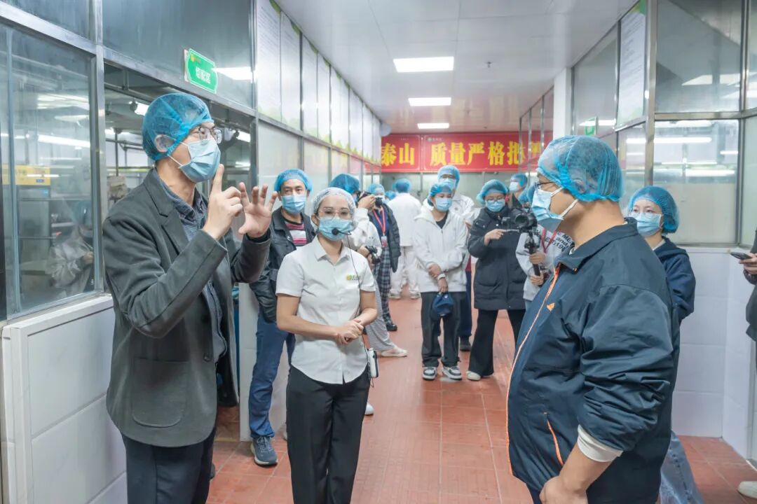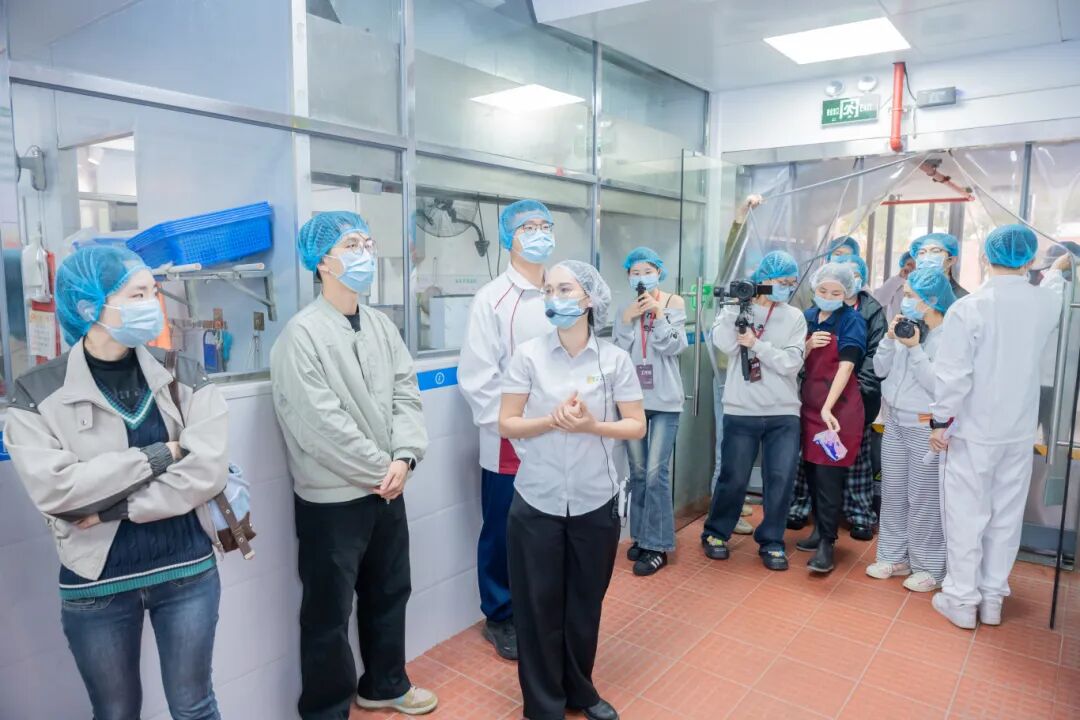 参观队伍依次经过仓储区、清洗区、切配区、烹饪区、餐具洗消间及食品留样柜等关键区域。庄经理详细介绍了食材采购查验、仓储管理、清洗加工、烹饪制作、餐具消毒、食品留样等各个环节的标准化操作流程与卫生管理规范。师生们亲眼见证了后厨整洁的环境、分类清晰的用具、规范的操作以及“互联网+明厨亮灶”智慧监管系统的实际运行。通过零距离接触,师生代表对饭堂严谨、透明的工作流程有了直观深入的了解,增进了对餐饮服务工作的理解与信任。