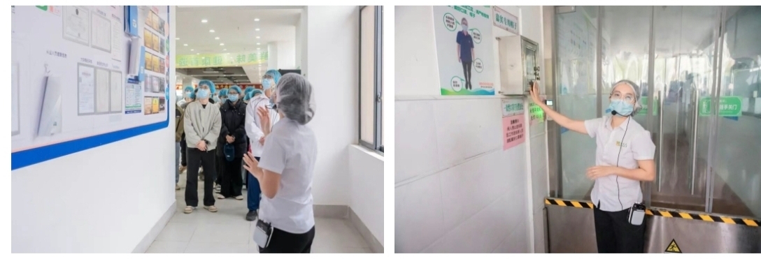 演练结束后,活动进入“明厨亮灶,食安共筑”后厨参观环节。师生代表们在第一饭堂经理庄妃晓的引导与讲解下,穿戴好一次性防护用品,有序走进第一饭堂的后厨操作区域。