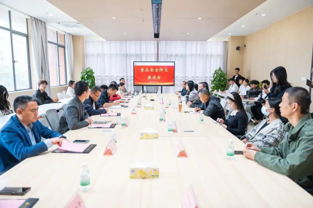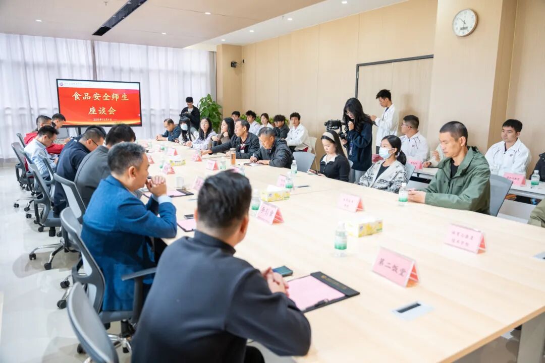 实地参观后活动转入交流研讨环节。师生代表与学校领导、相关部门负责人、第一饭堂、第二饭堂经理齐聚7号楼201会议室,召开“食品安全师生座谈会”。