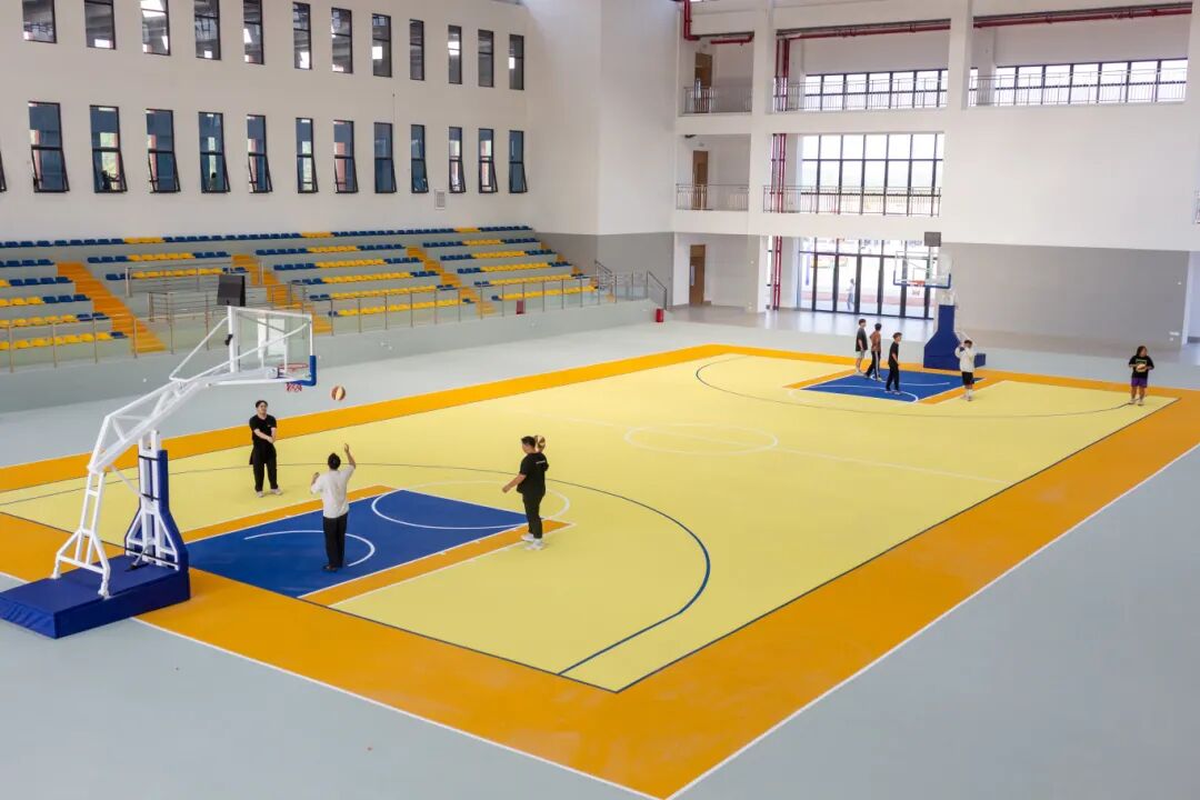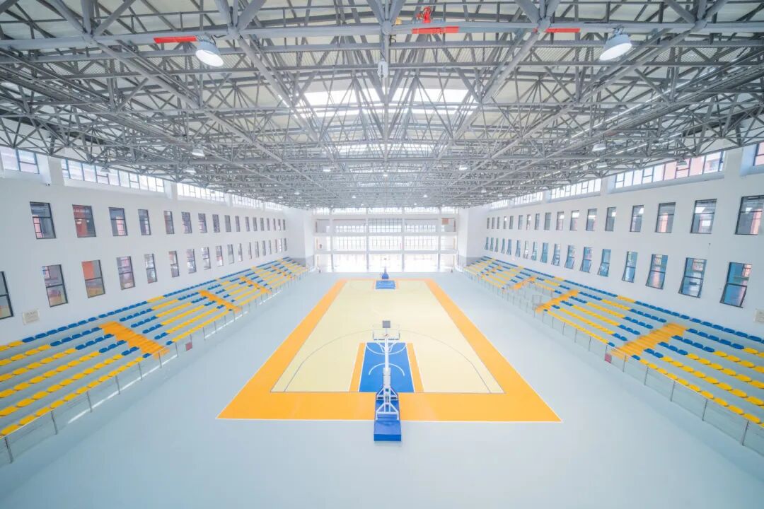 篮球馆两侧设有可容纳820余名观众的看台,视野开阔,安全通道规划合理,确保人员流动高效顺畅,足以满足各级篮球赛事的举办需求,还可兼顾文艺汇演、开学典礼、毕业典礼等大型校园活动。